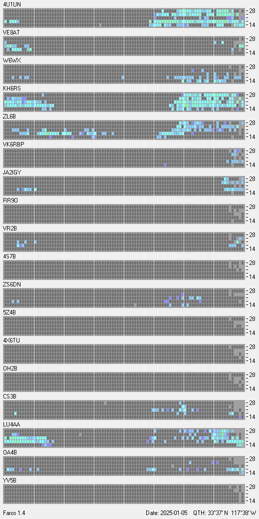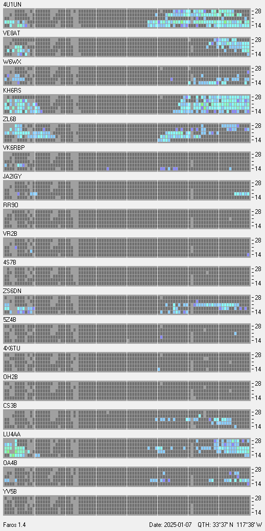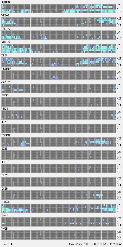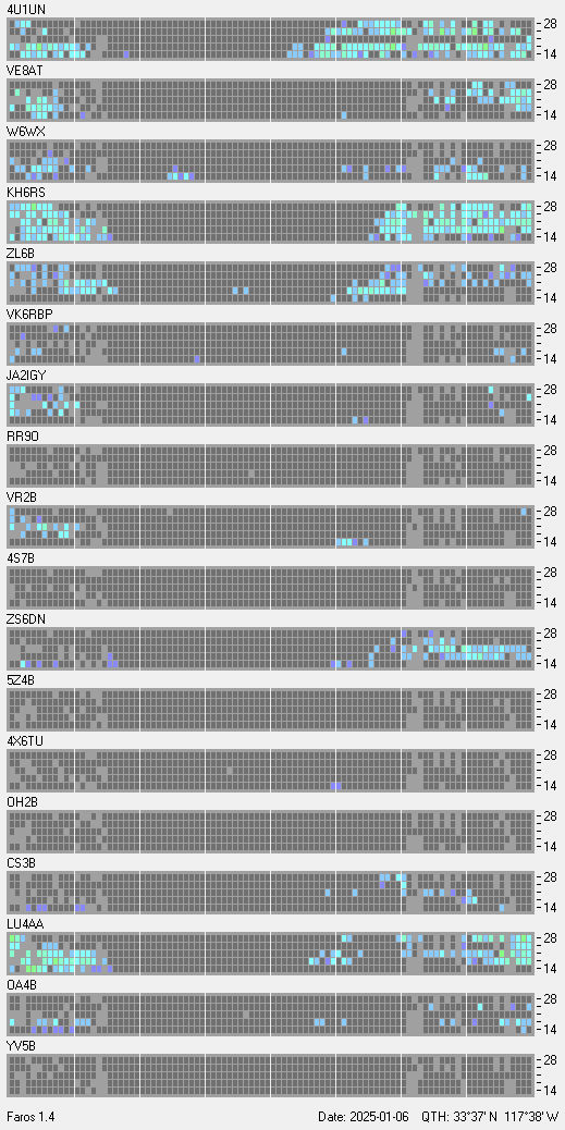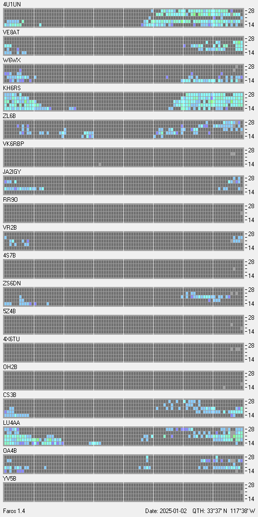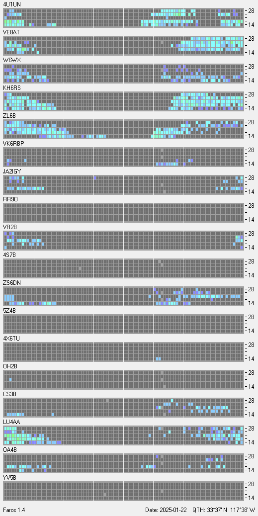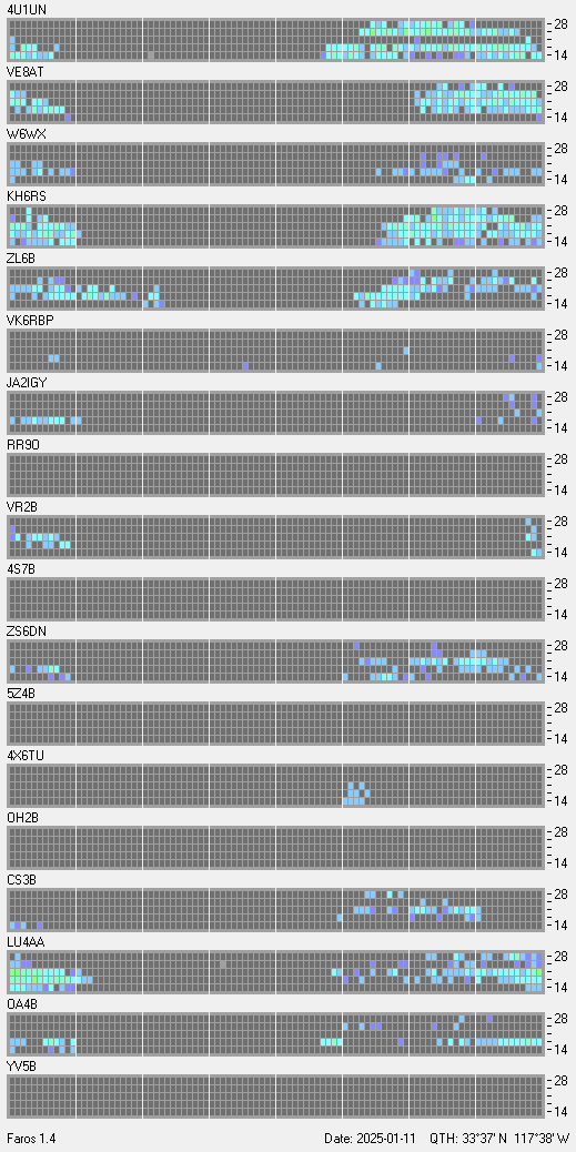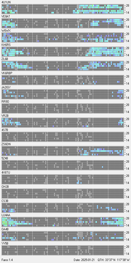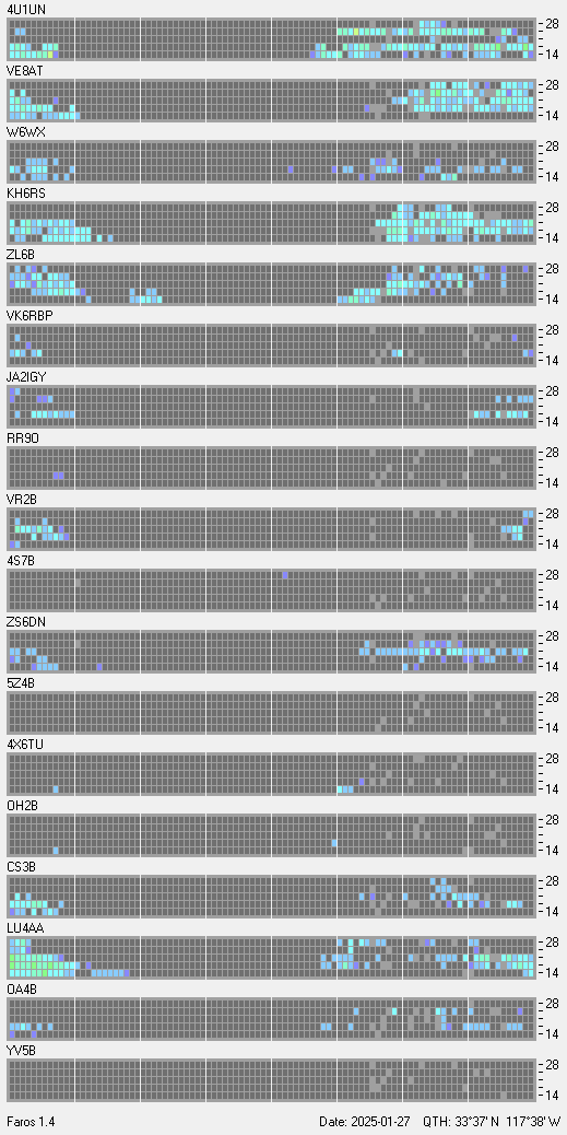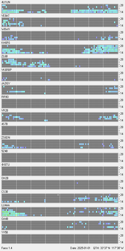 This is a record of NCDXF Beacon received at W6SI station using FAROS 1.4 monitor software. There are 18 beacons throughout the world, it records each ham band between 20m to 10m bands, including WARC bands. Each row on the given beacon block represents the band, 20, 17, 15, 12 and 10 meters, from the bottom to the top. The chart shows the relative signal strength (S/N ratio) of the received beacon. |