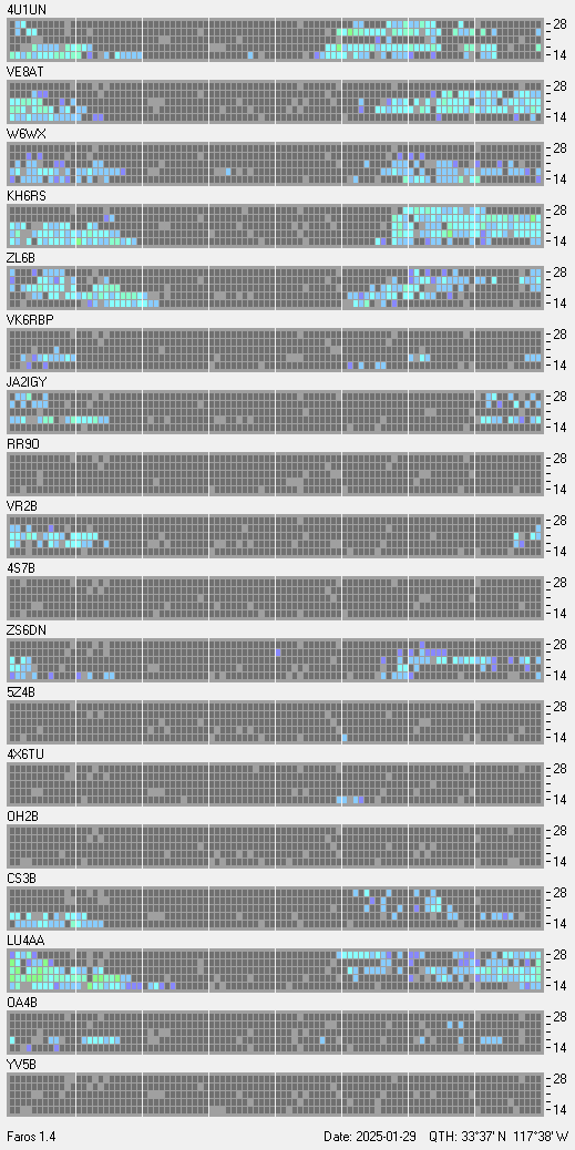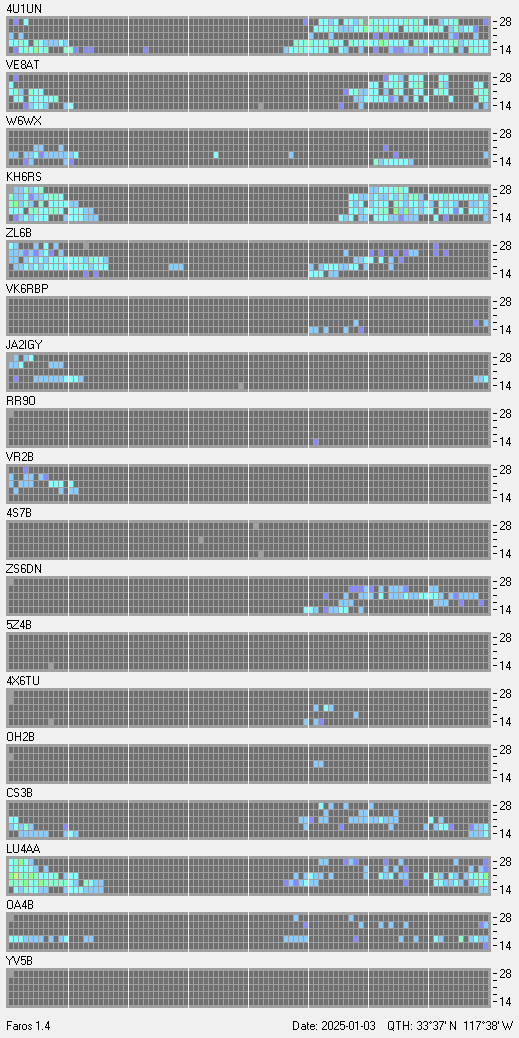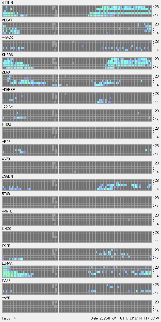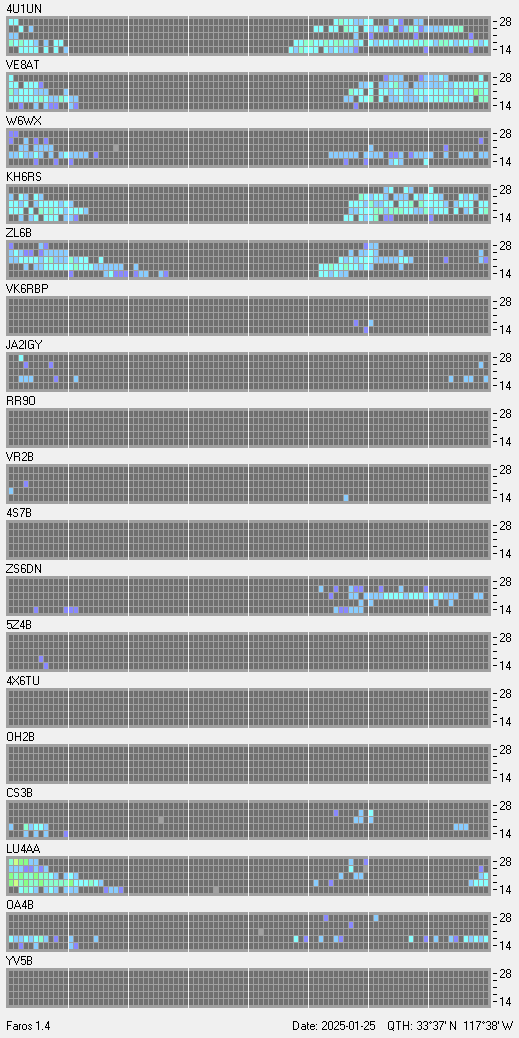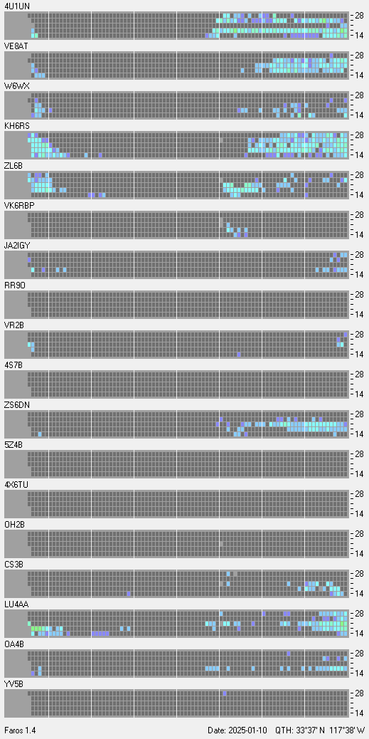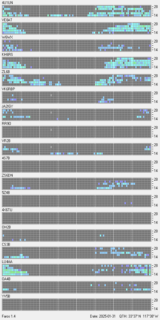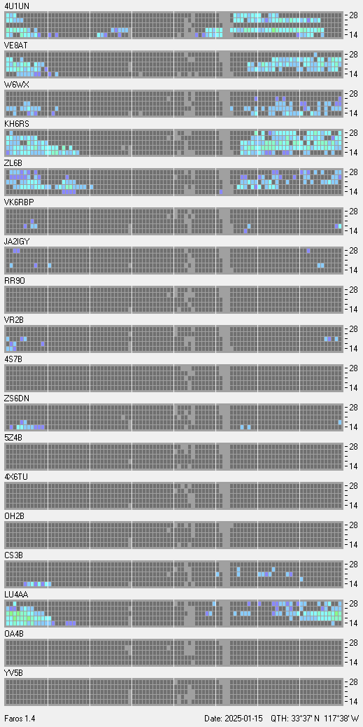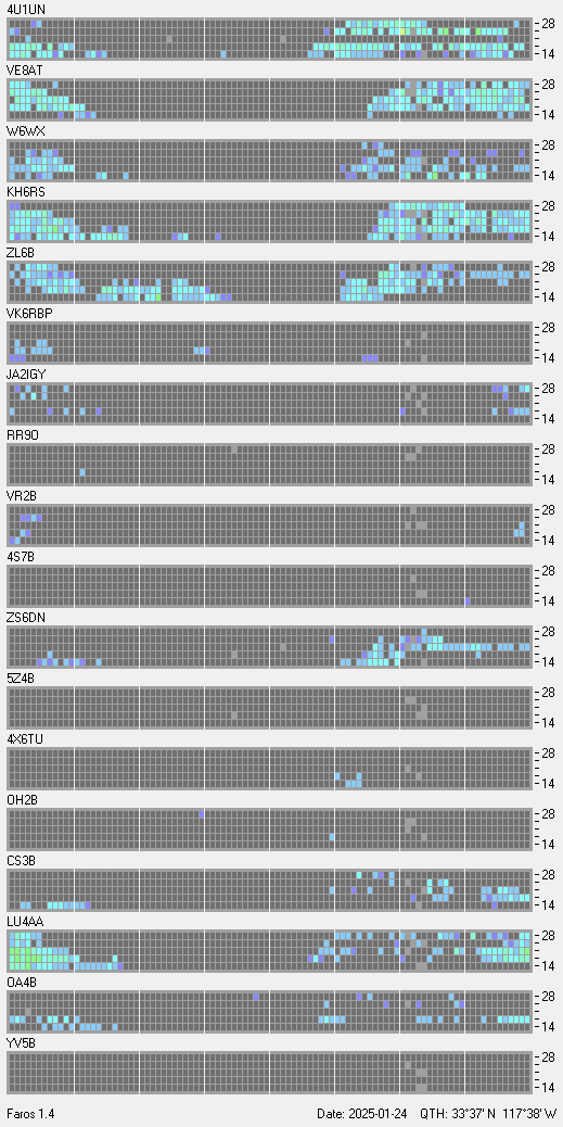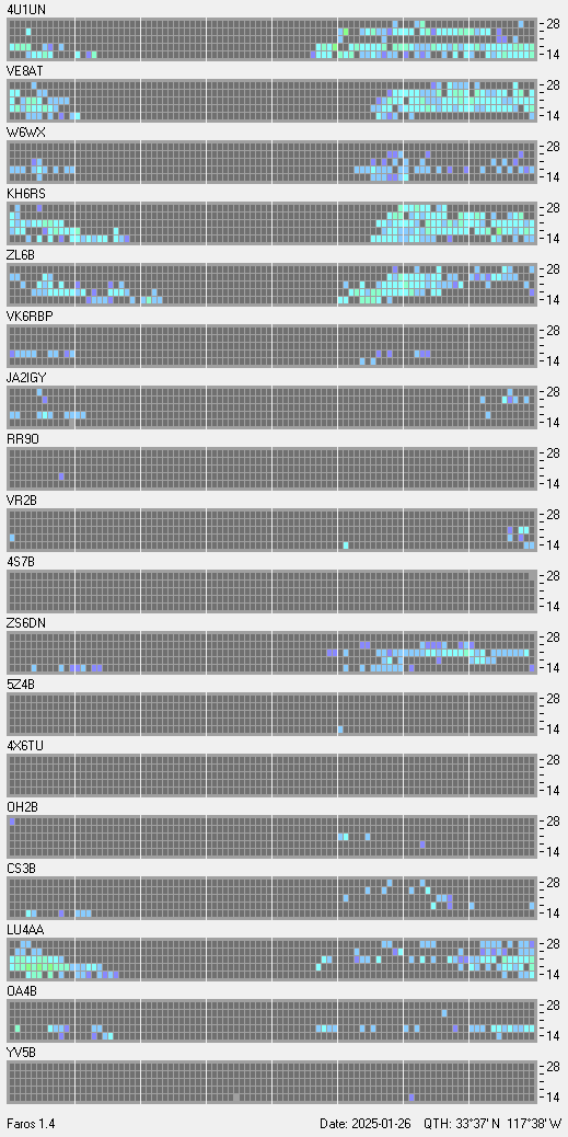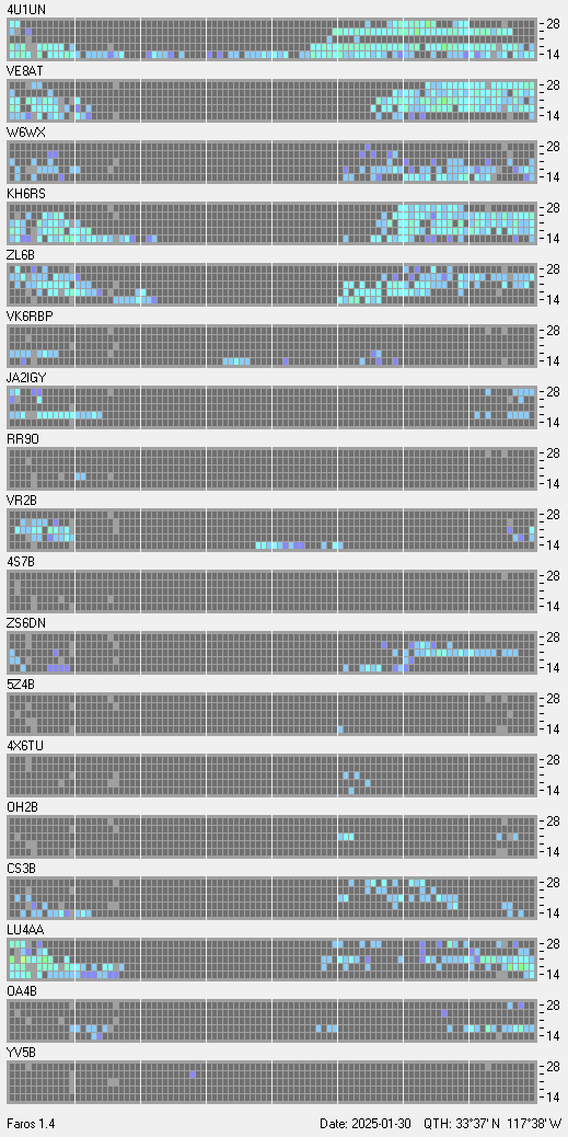 This is a record of NCDXF Beacon received at W6SI station using FAROS 1.4 monitor software. There are 18 beacons throughout the world, it records each ham band between 20m to 10m bands, including WARC bands. Each row on the given beacon block represents the band, 20, 17, 15, 12 and 10 meters, from the bottom to the top. The chart shows the relative signal strength (S/N ratio) of the received beacon. |