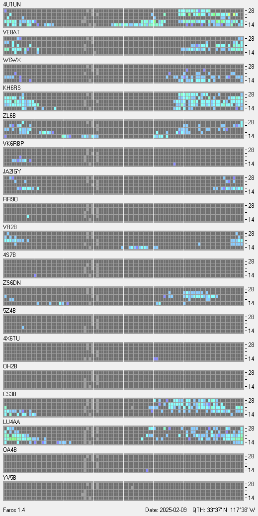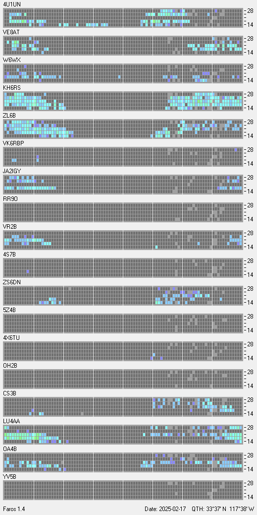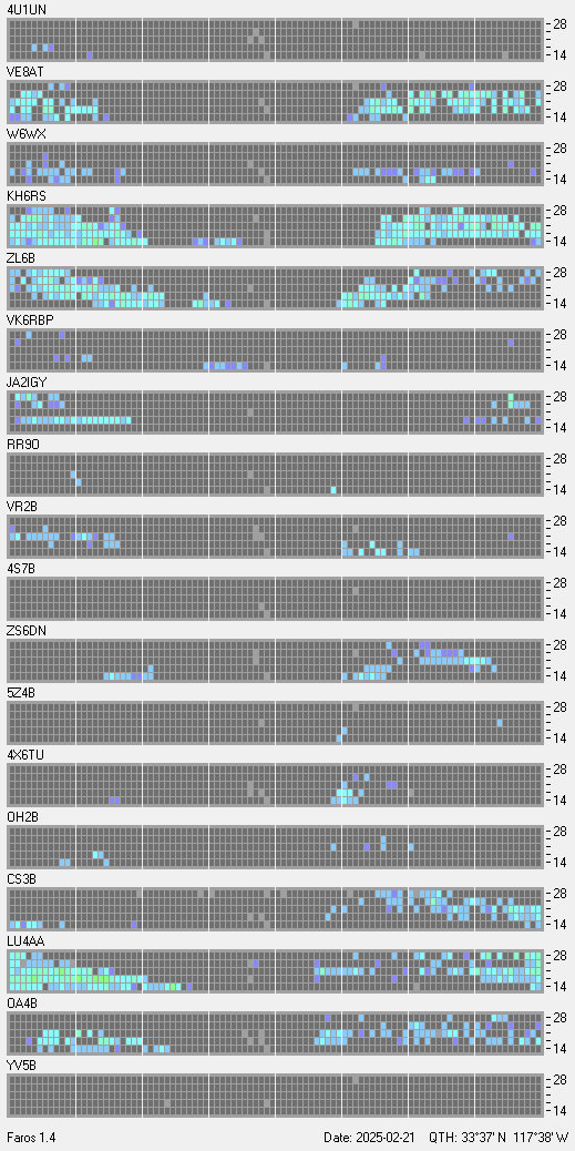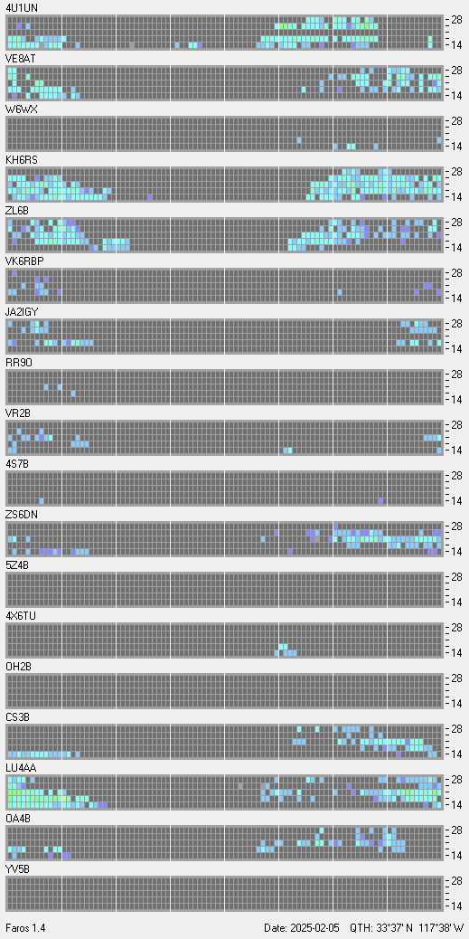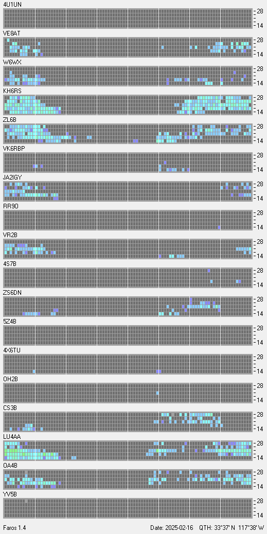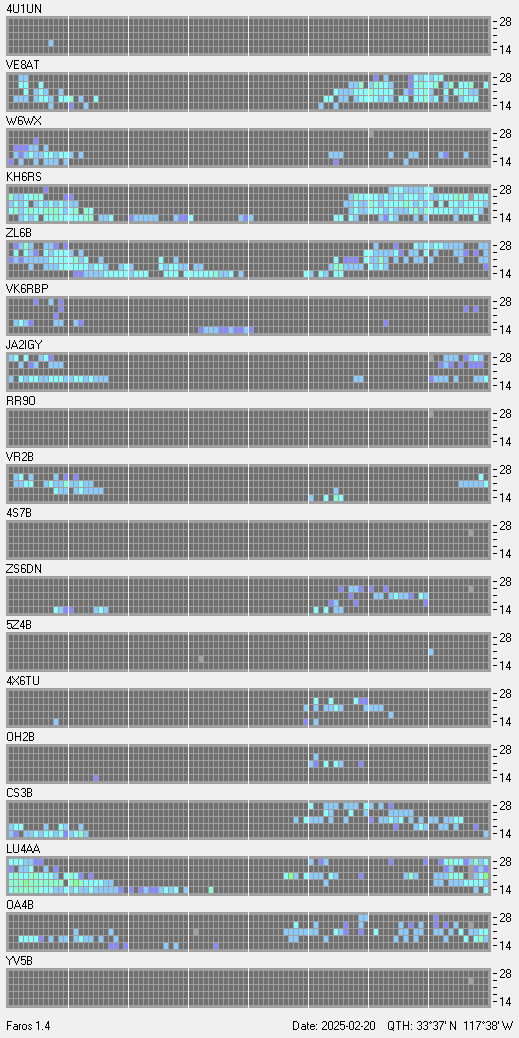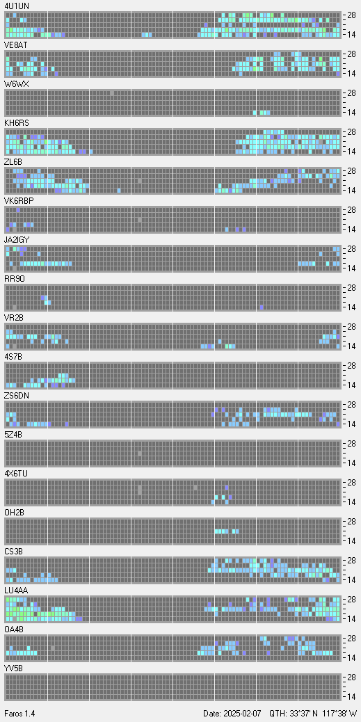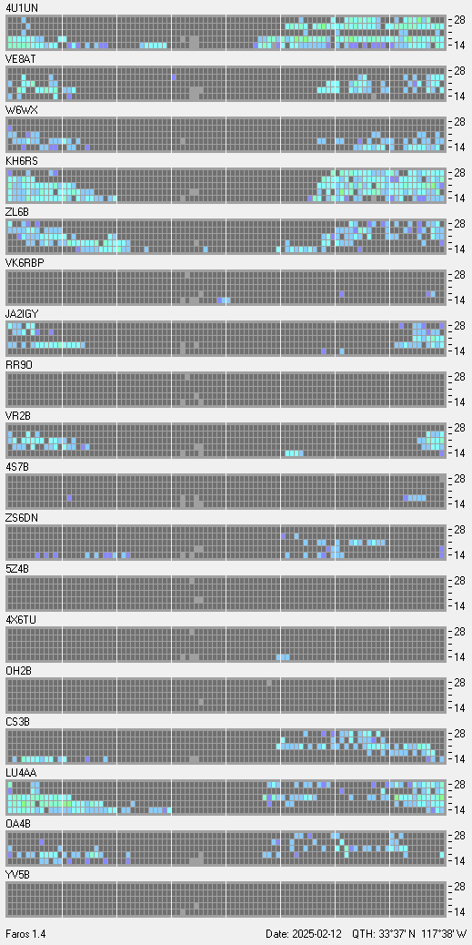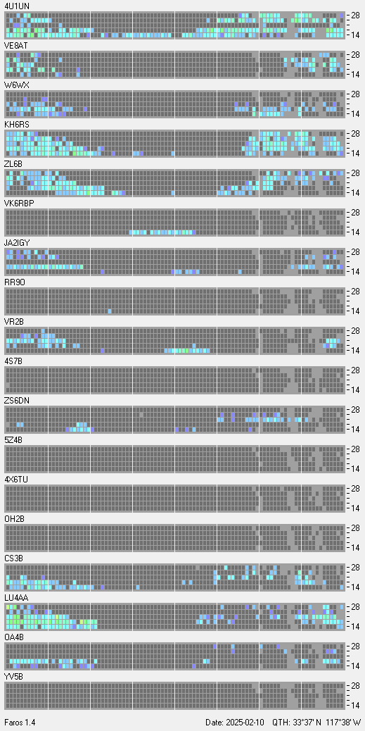 This is a record of NCDXF Beacon received at W6SI station using FAROS 1.4 monitor software. There are 18 beacons throughout the world, it records each ham band between 20m to 10m bands, including WARC bands. Each row on the given beacon block represents the band, 20, 17, 15, 12 and 10 meters, from the bottom to the top. The chart shows the relative signal strength (S/N ratio) of the received beacon. |