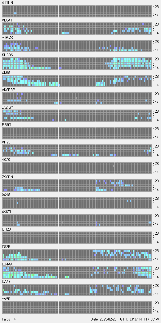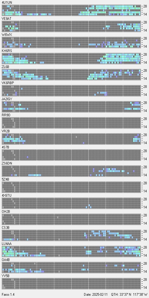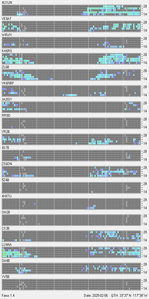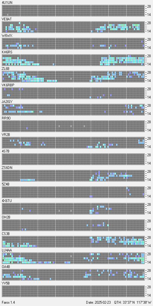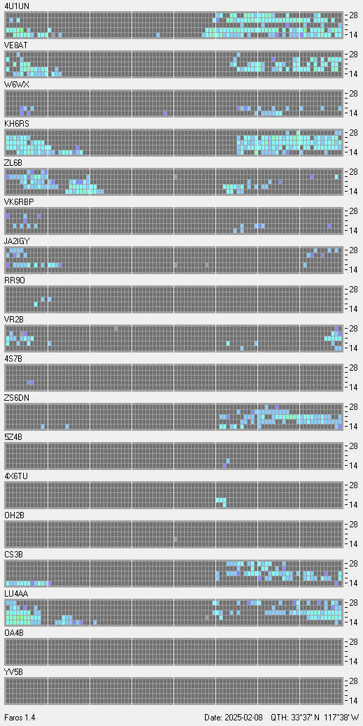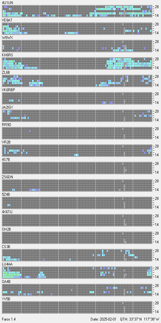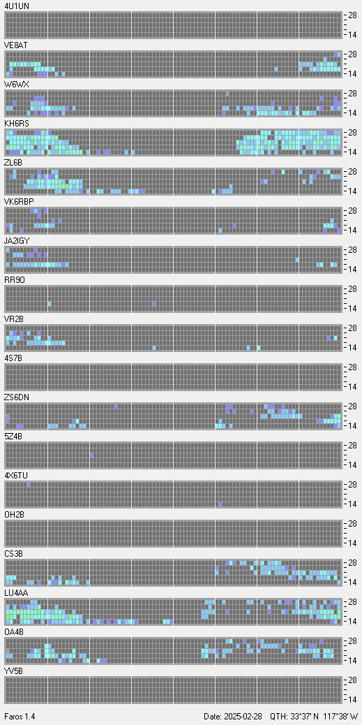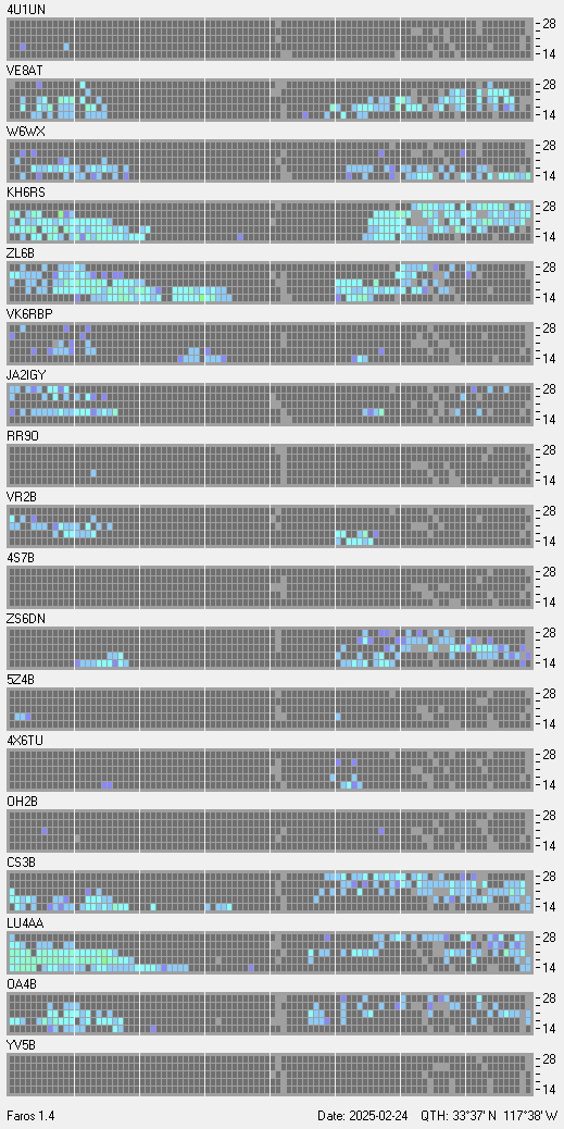 This is a record of NCDXF Beacon received at W6SI station using FAROS 1.4 monitor software. There are 18 beacons throughout the world, it records each ham band between 20m to 10m bands, including WARC bands. Each row on the given beacon block represents the band, 20, 17, 15, 12 and 10 meters, from the bottom to the top. The chart shows the relative signal strength (S/N ratio) of the received beacon. |