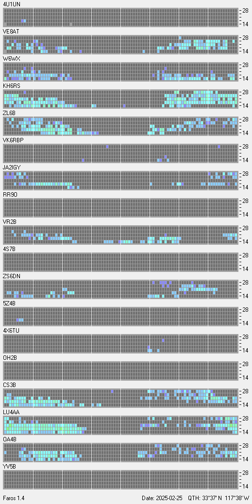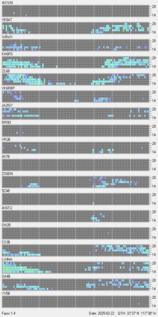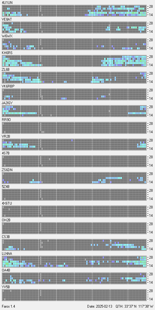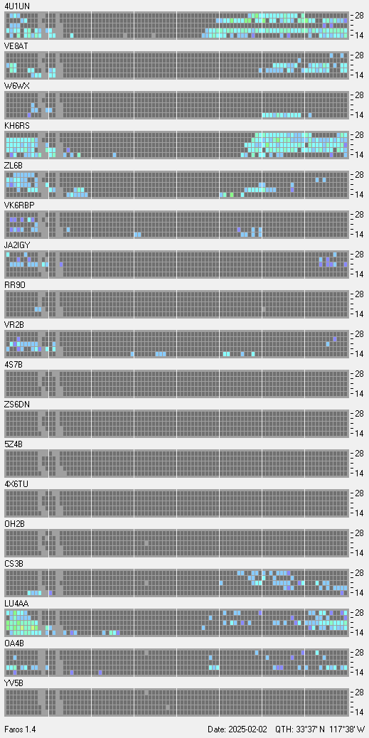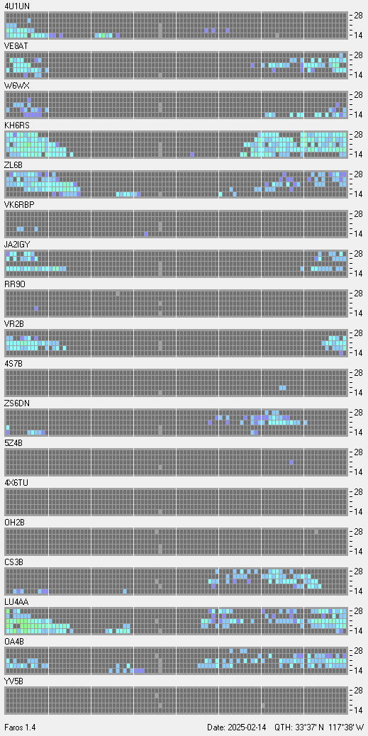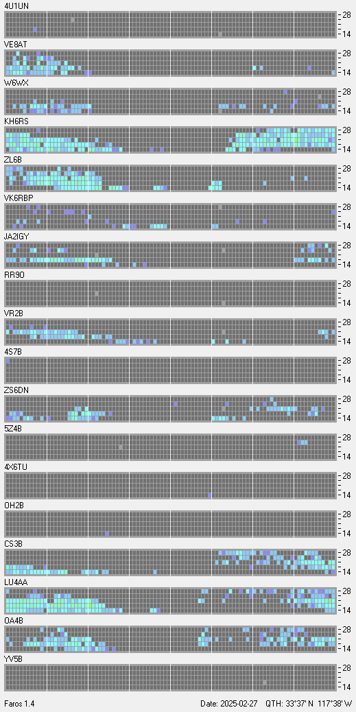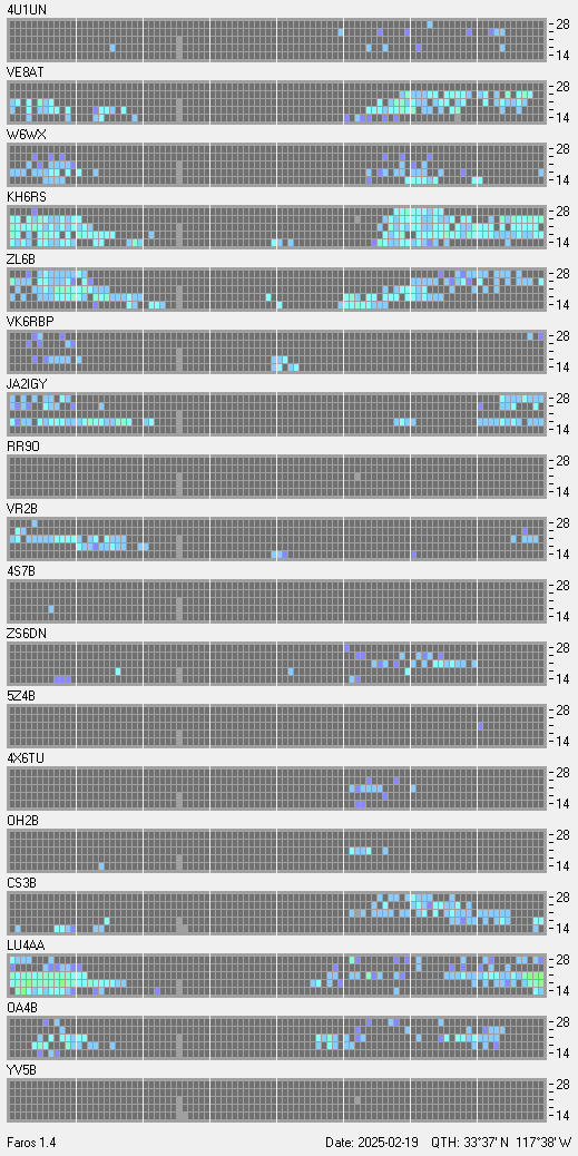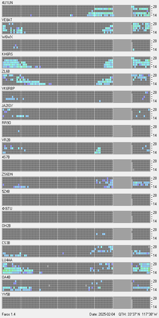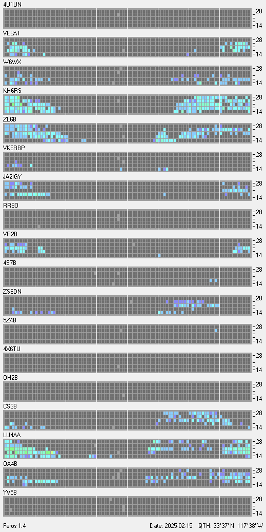 This is a record of NCDXF Beacon received at W6SI station using FAROS 1.4 monitor software. There are 18 beacons throughout the world, it records each ham band between 20m to 10m bands, including WARC bands. Each row on the given beacon block represents the band, 20, 17, 15, 12 and 10 meters, from the bottom to the top. The chart shows the relative signal strength (S/N ratio) of the received beacon. |