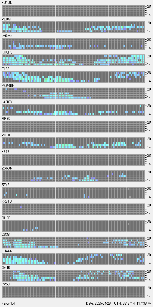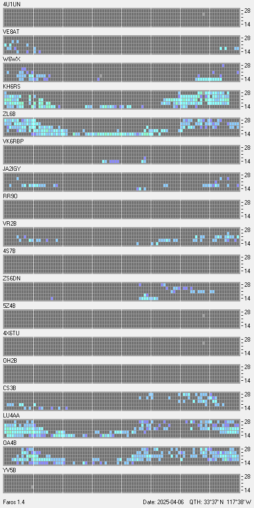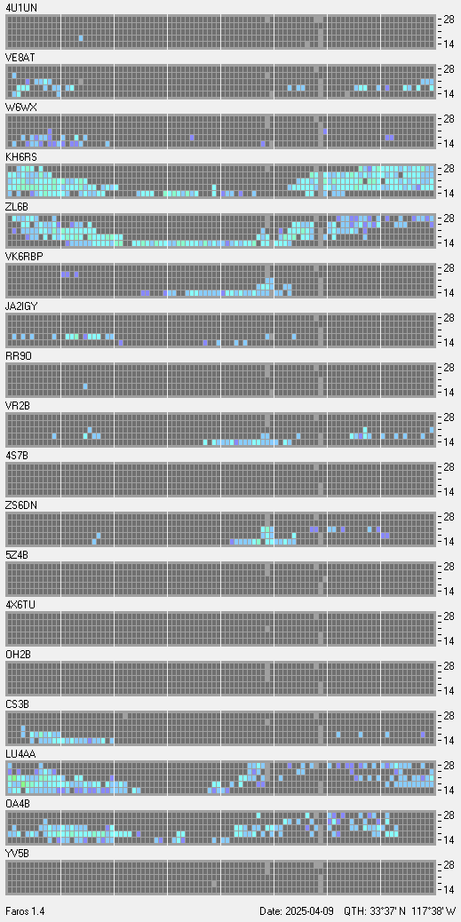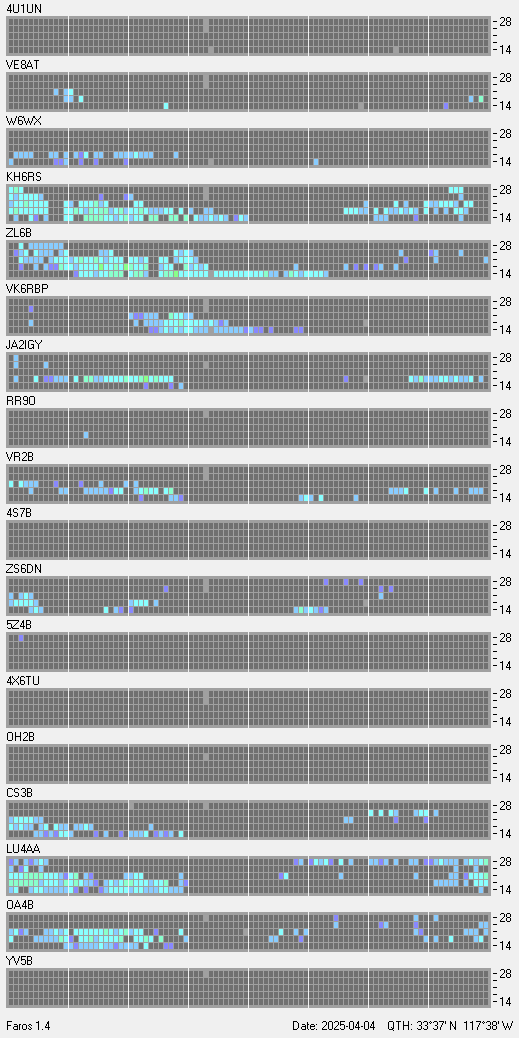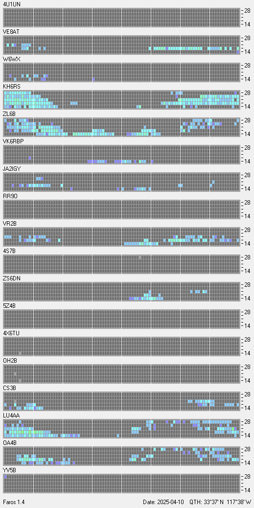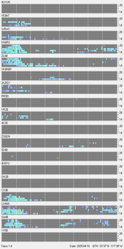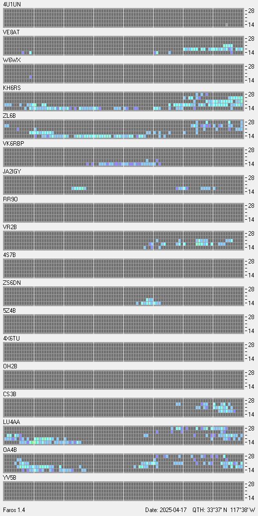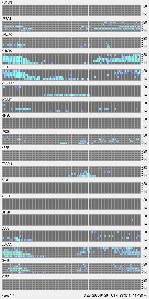 This is a record of NCDXF Beacon received at W6SI station using FAROS 1.4 monitor software. There are 18 beacons throughout the world, it records each ham band between 20m to 10m bands, including WARC bands. Each row on the given beacon block represents the band, 20, 17, 15, 12 and 10 meters, from the bottom to the top. The chart shows the relative signal strength (S/N ratio) of the received beacon. |