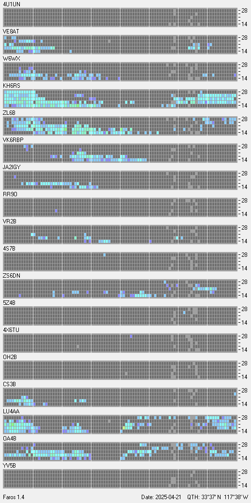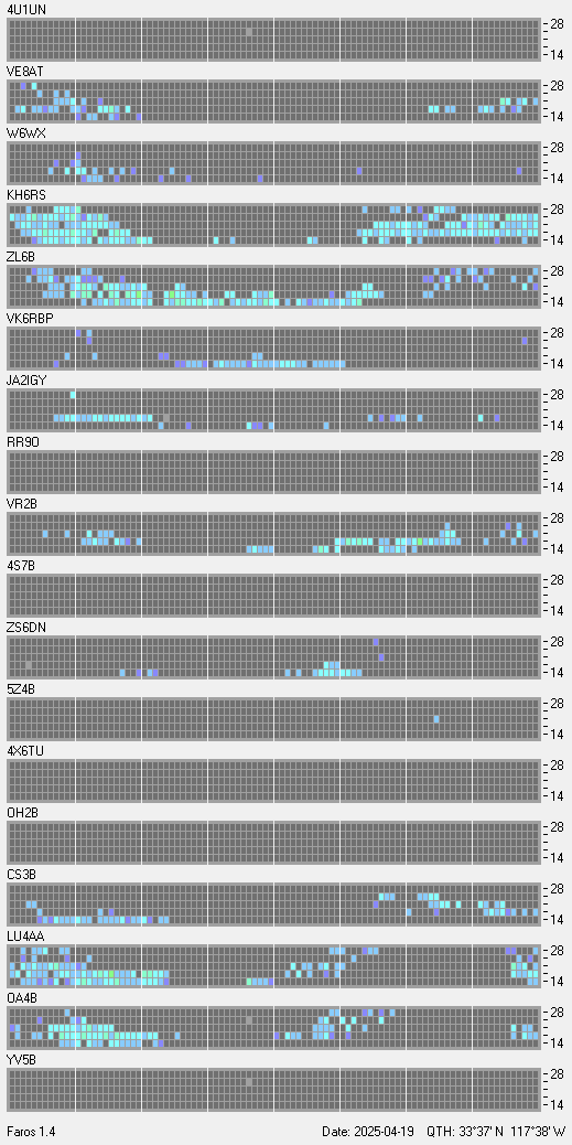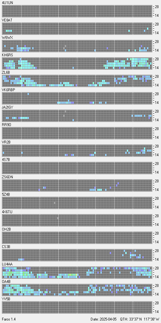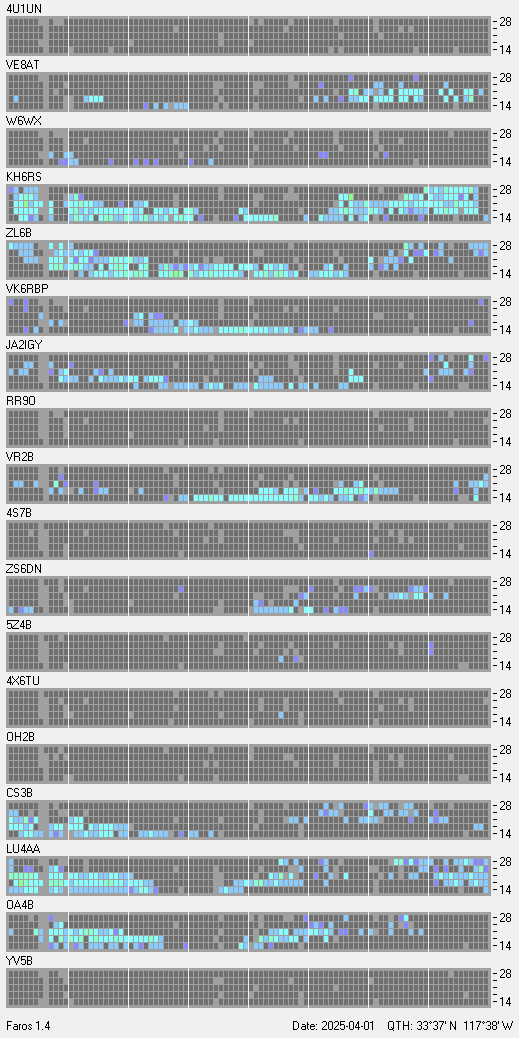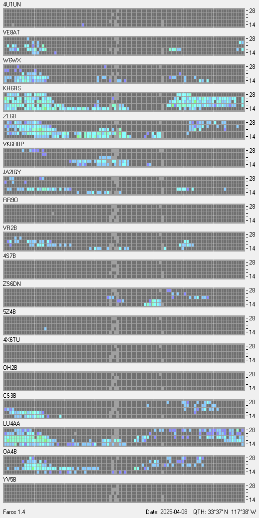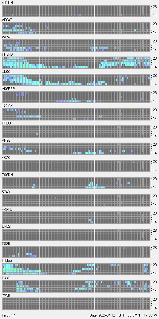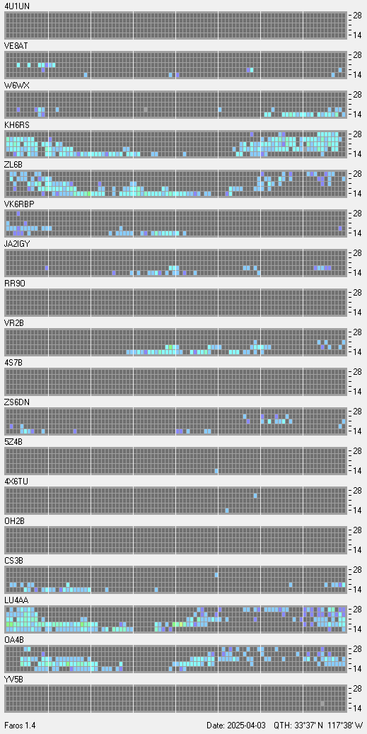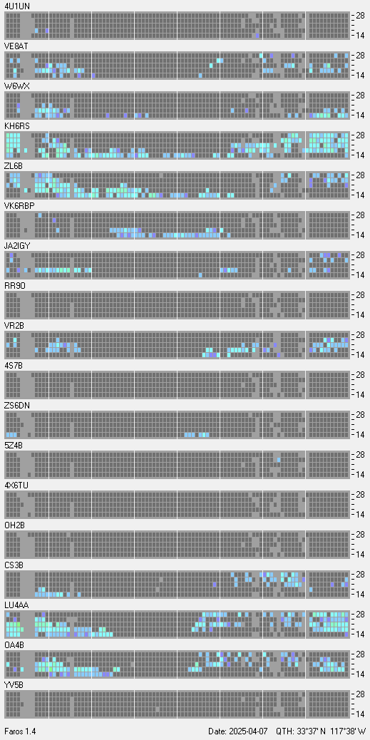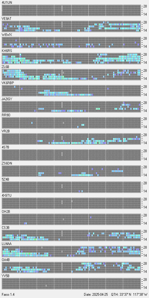 This is a record of NCDXF Beacon received at W6SI station using FAROS 1.4 monitor software. There are 18 beacons throughout the world, it records each ham band between 20m to 10m bands, including WARC bands. Each row on the given beacon block represents the band, 20, 17, 15, 12 and 10 meters, from the bottom to the top. The chart shows the relative signal strength (S/N ratio) of the received beacon. |