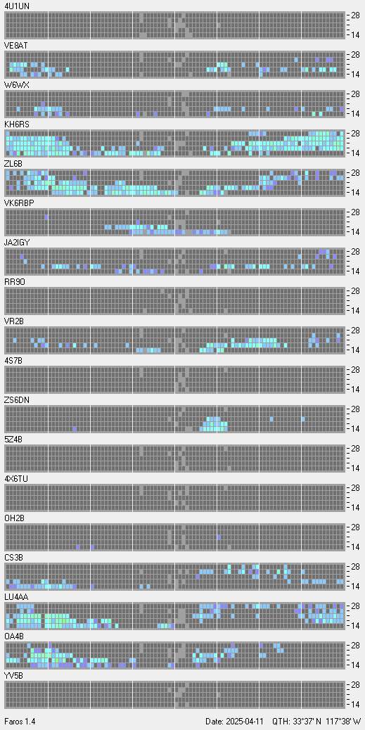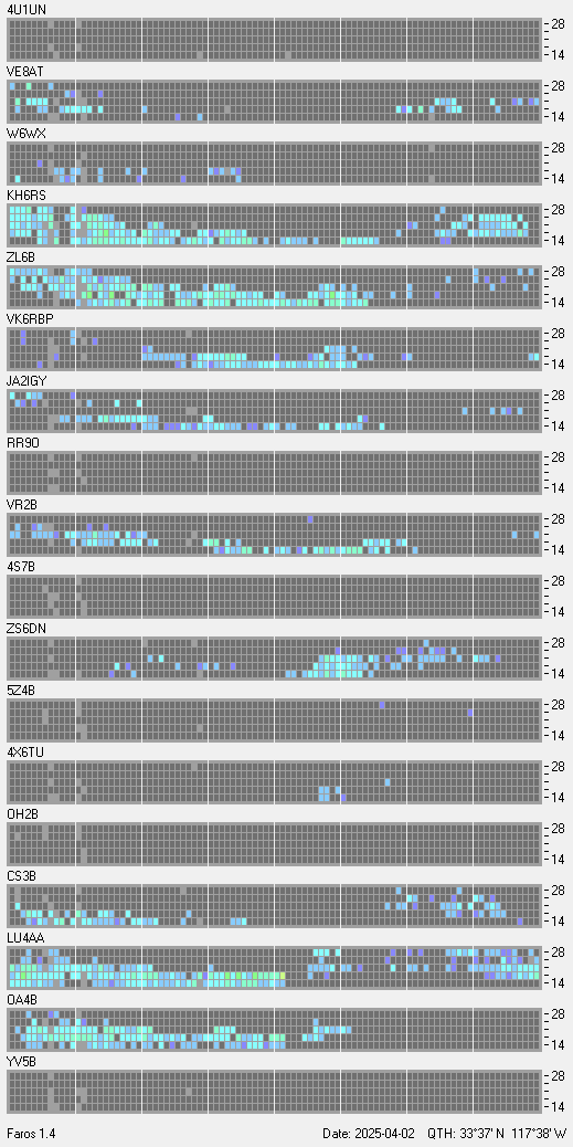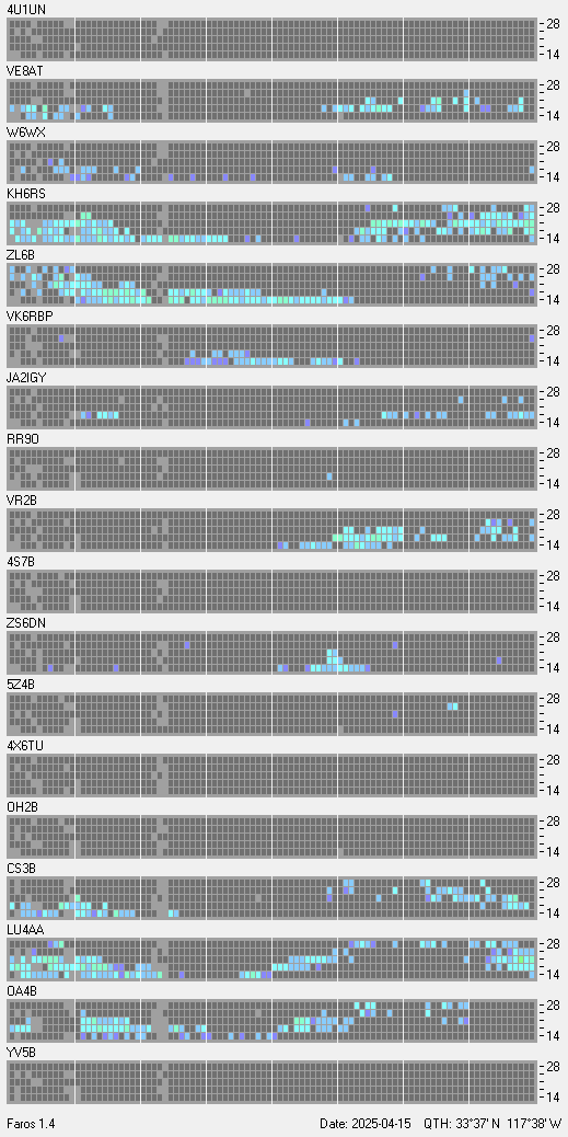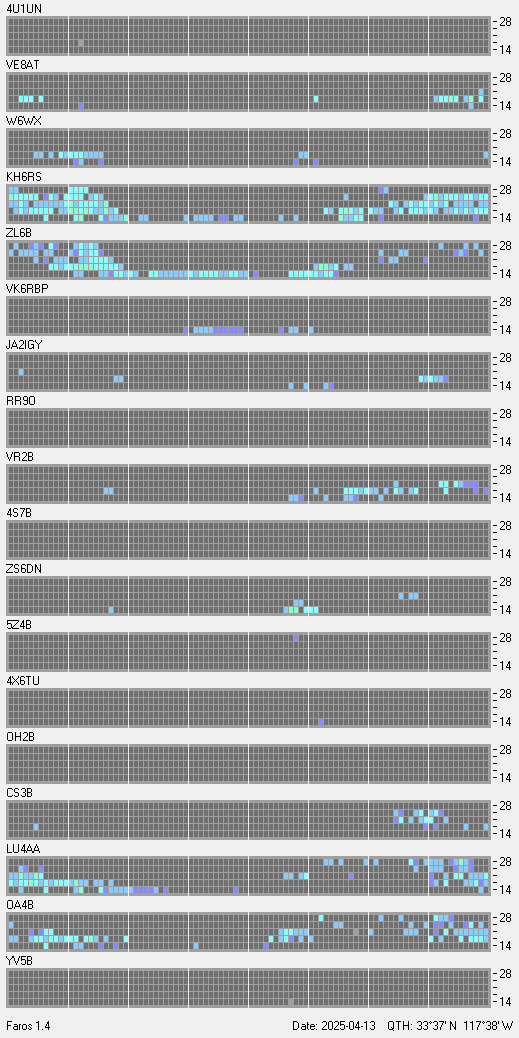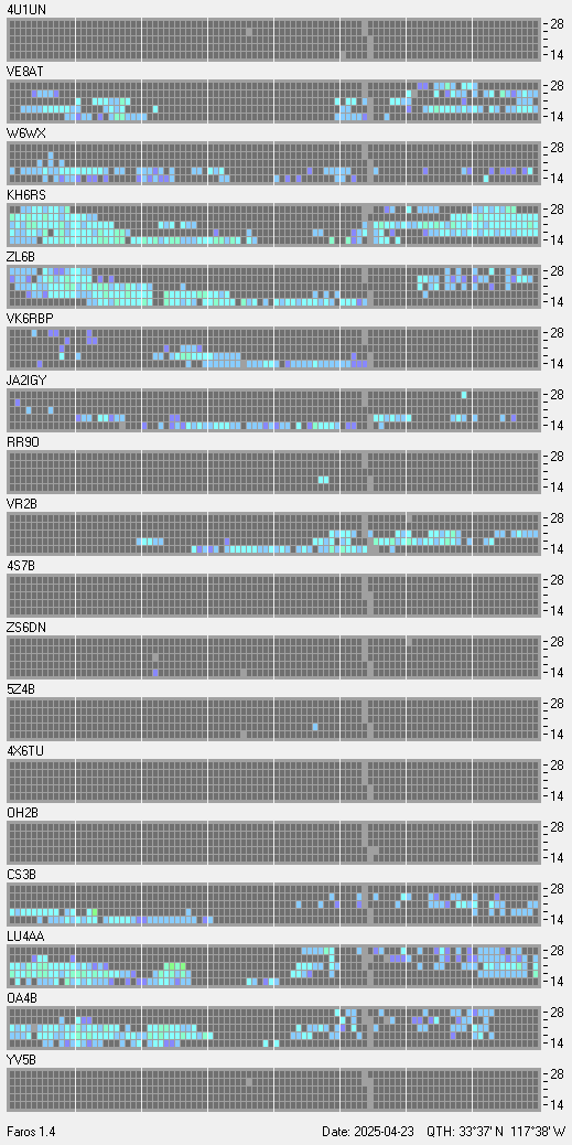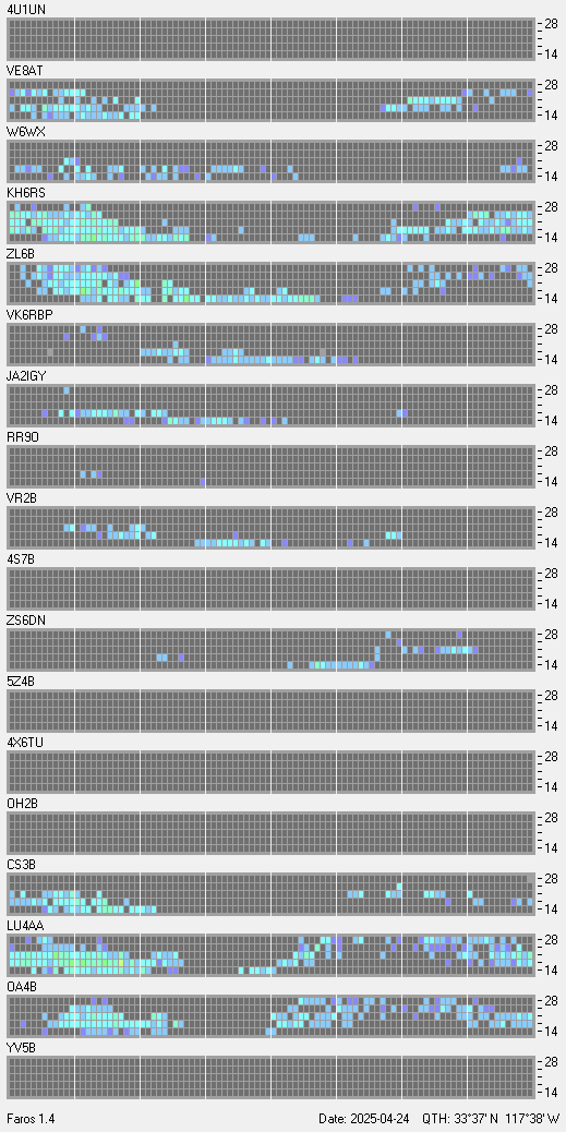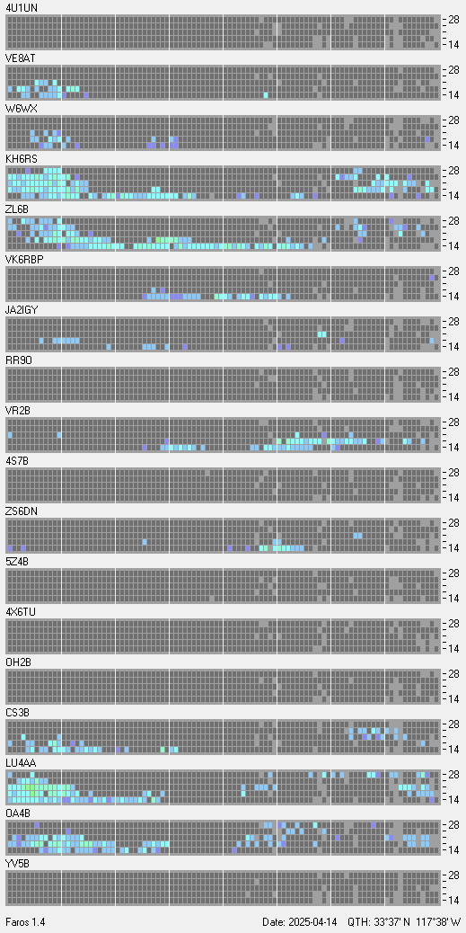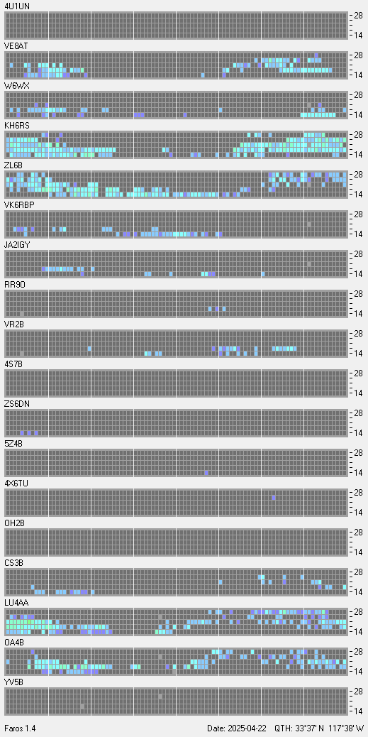 This is a record of NCDXF Beacon received at W6SI station using FAROS 1.4 monitor software. There are 18 beacons throughout the world, it records each ham band between 20m to 10m bands, including WARC bands. Each row on the given beacon block represents the band, 20, 17, 15, 12 and 10 meters, from the bottom to the top. The chart shows the relative signal strength (S/N ratio) of the received beacon. |