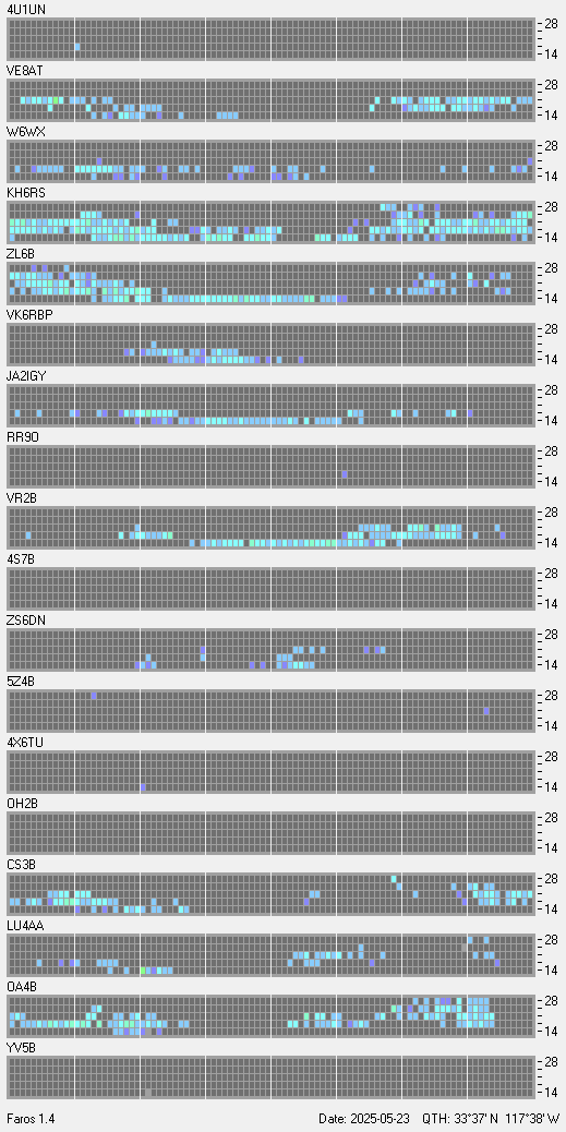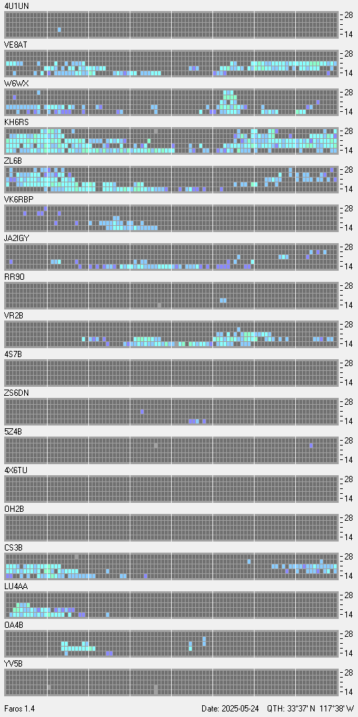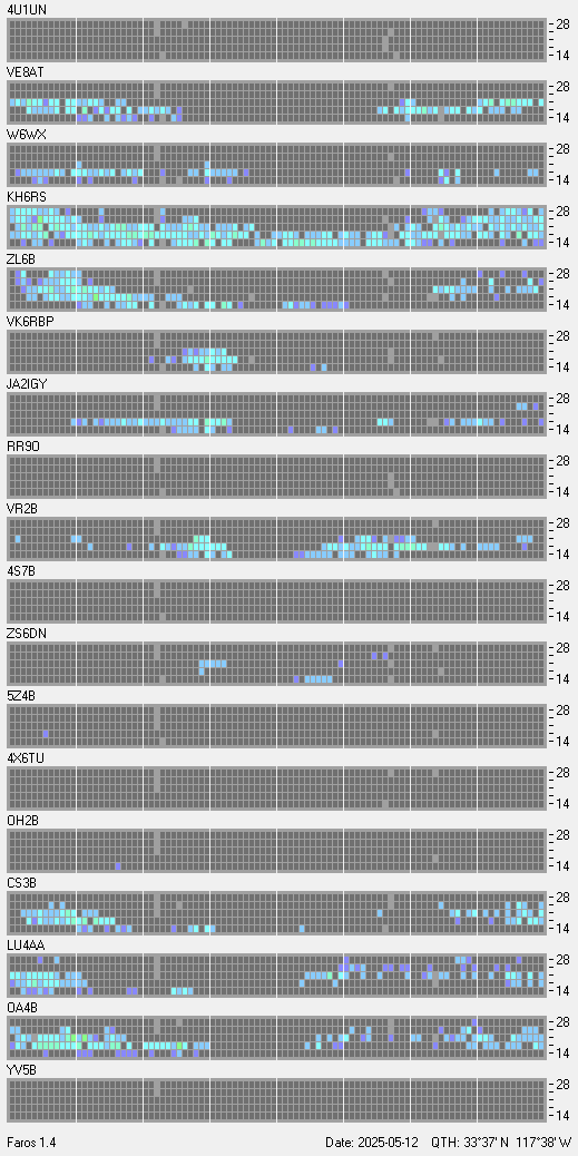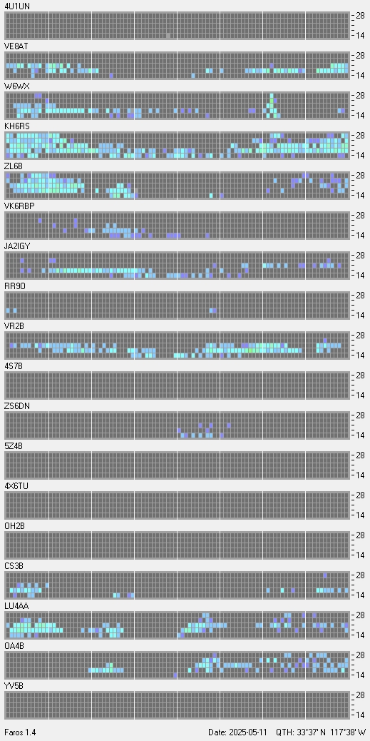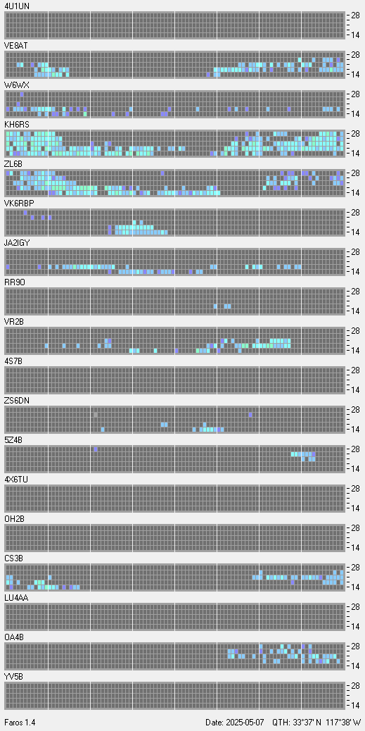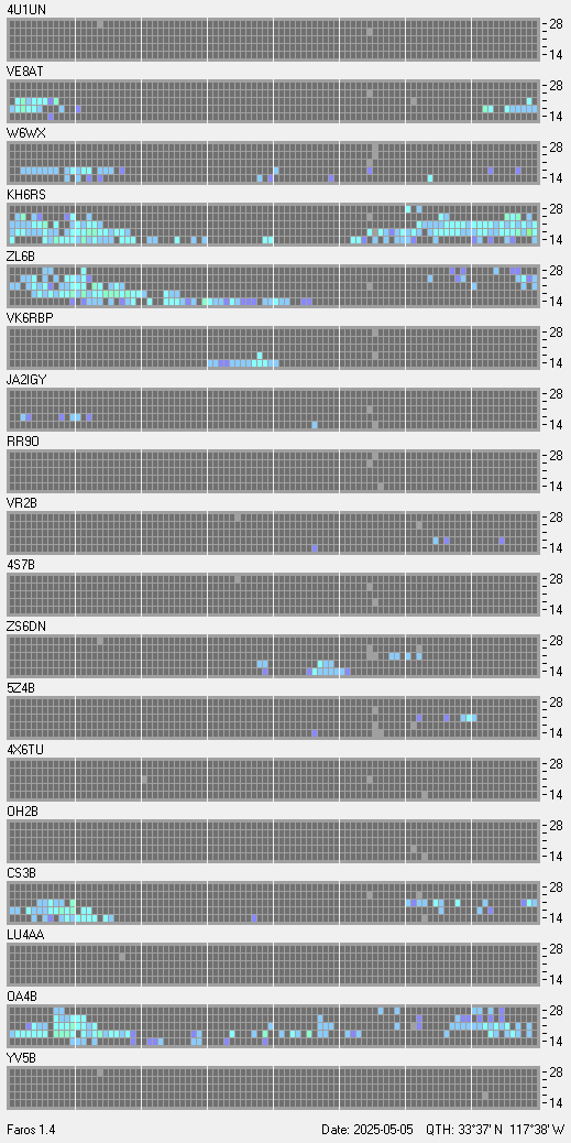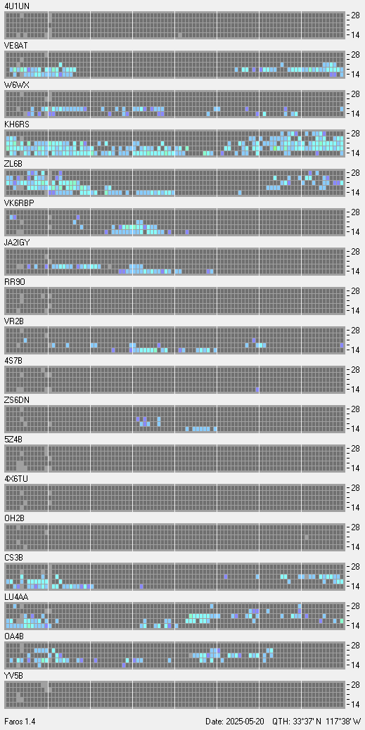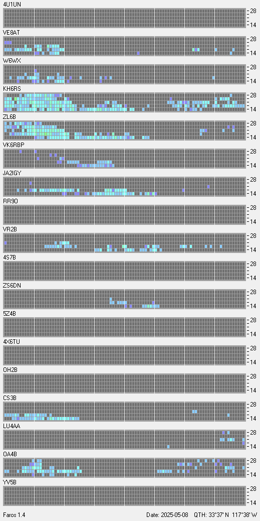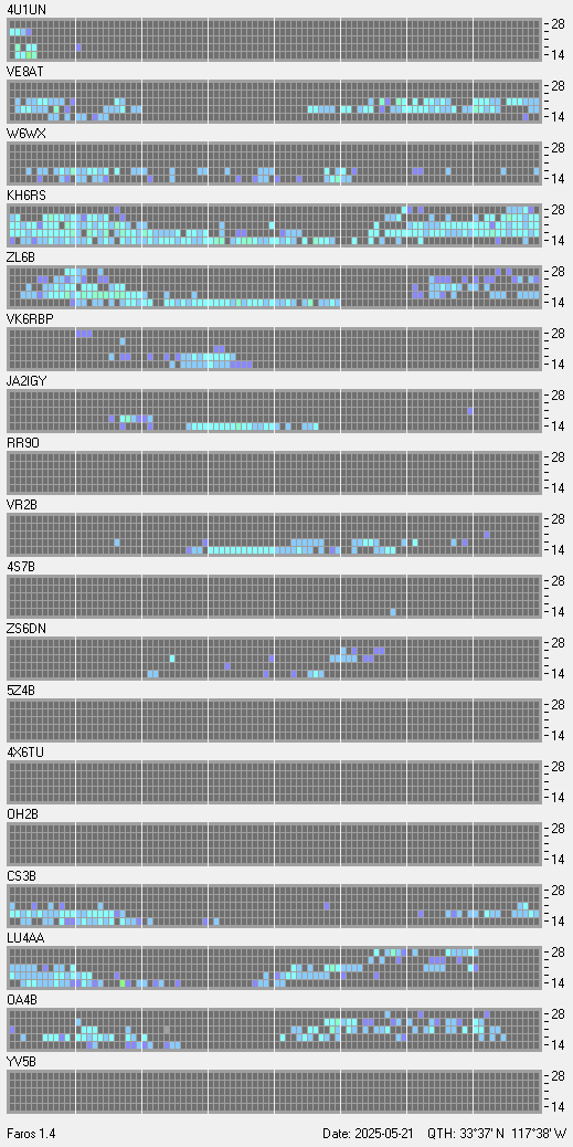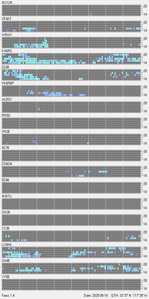 This is a record of NCDXF Beacon received at W6SI station using FAROS 1.4 monitor software. There are 18 beacons throughout the world, it records each ham band between 20m to 10m bands, including WARC bands. Each row on the given beacon block represents the band, 20, 17, 15, 12 and 10 meters, from the bottom to the top. The chart shows the relative signal strength (S/N ratio) of the received beacon. |