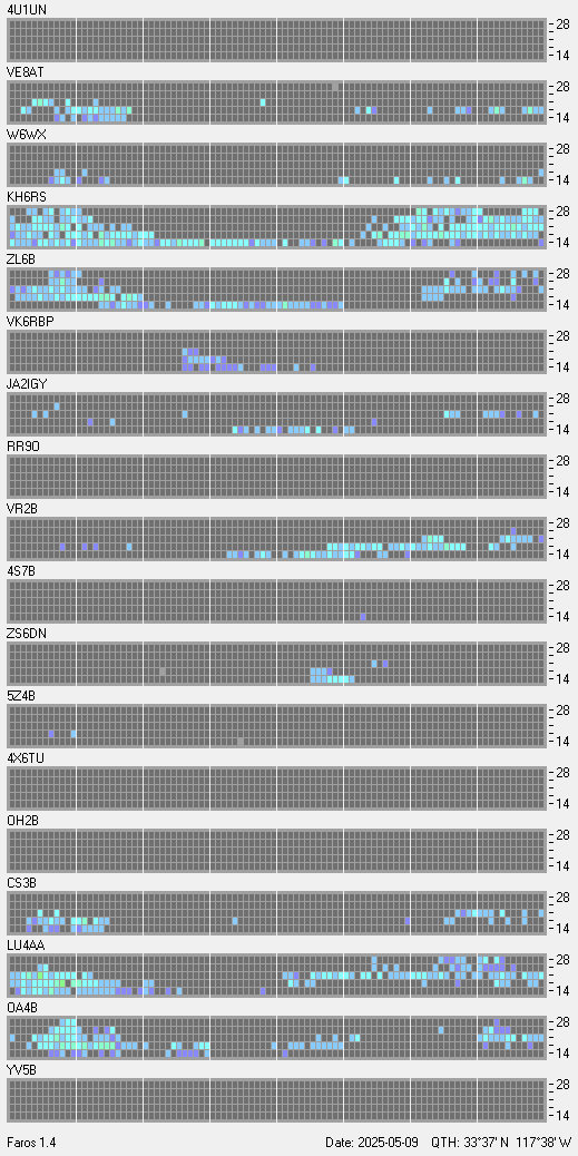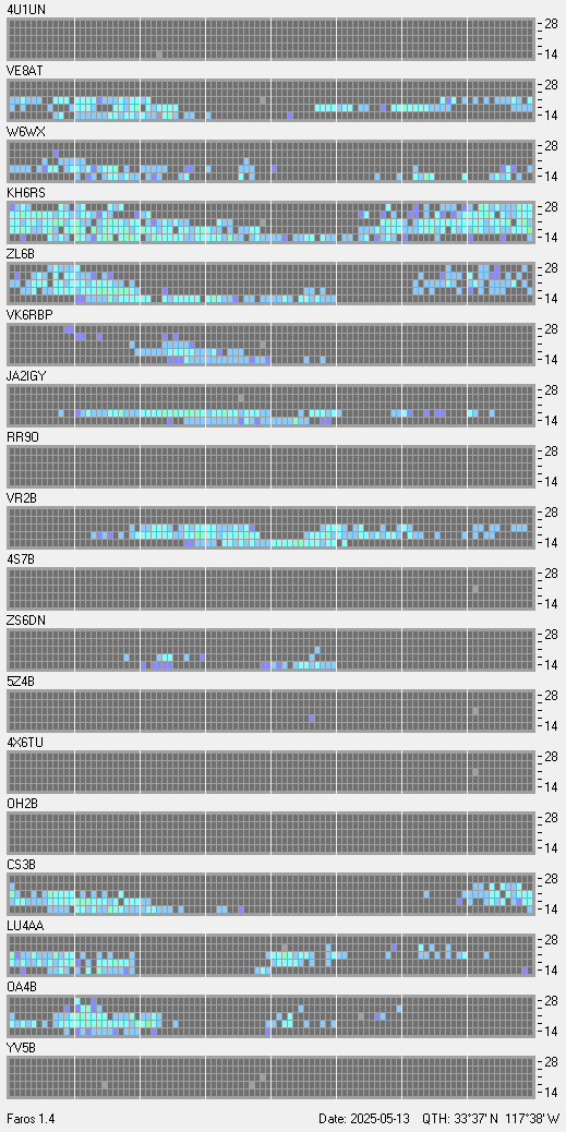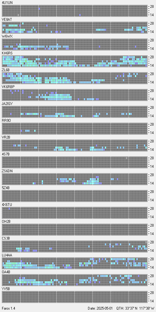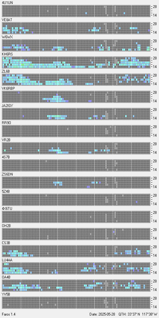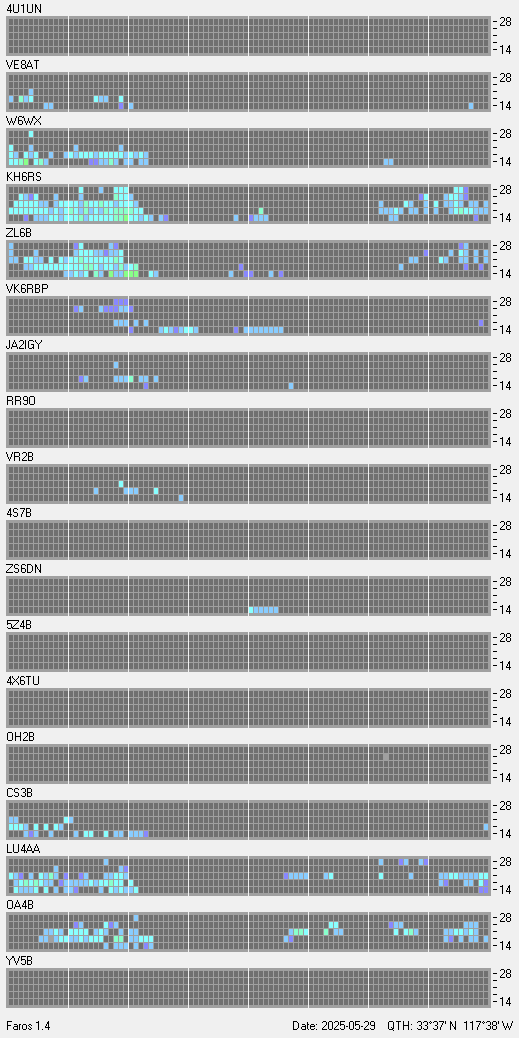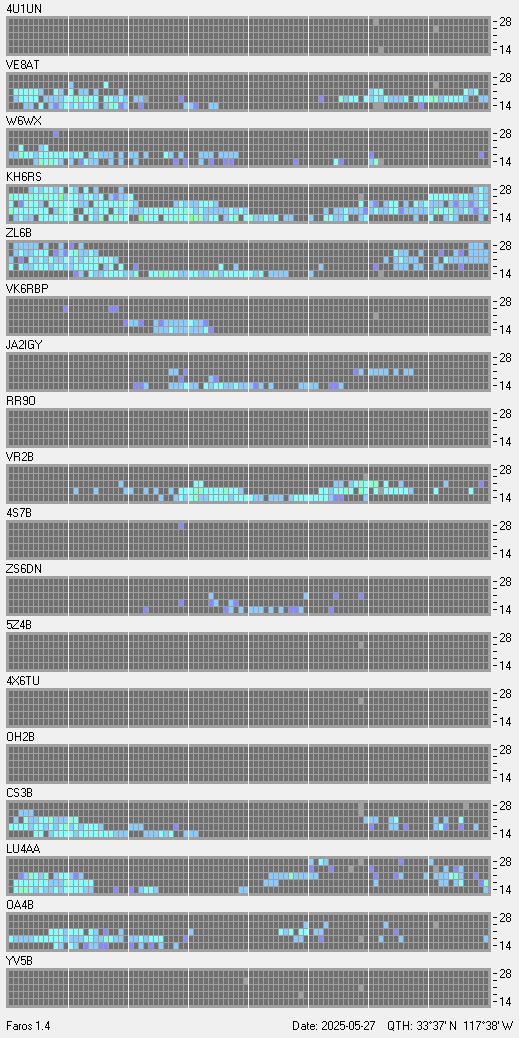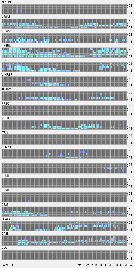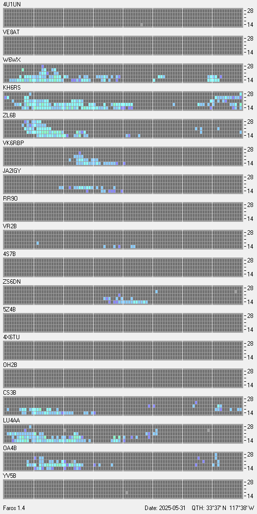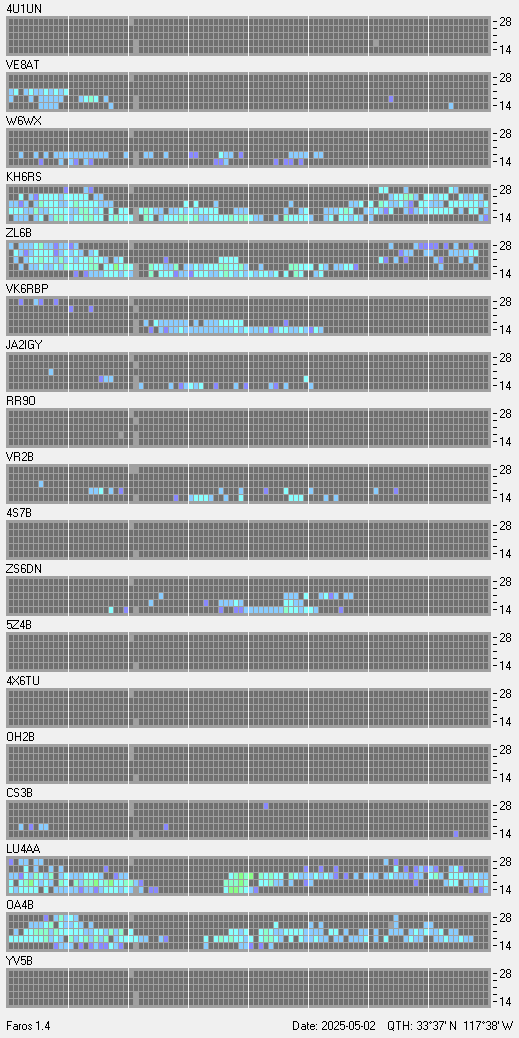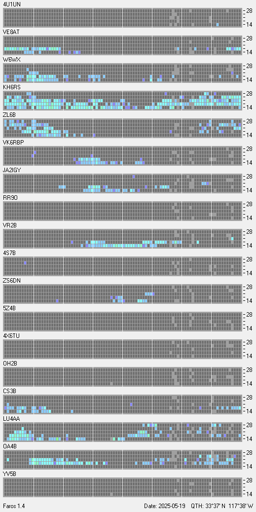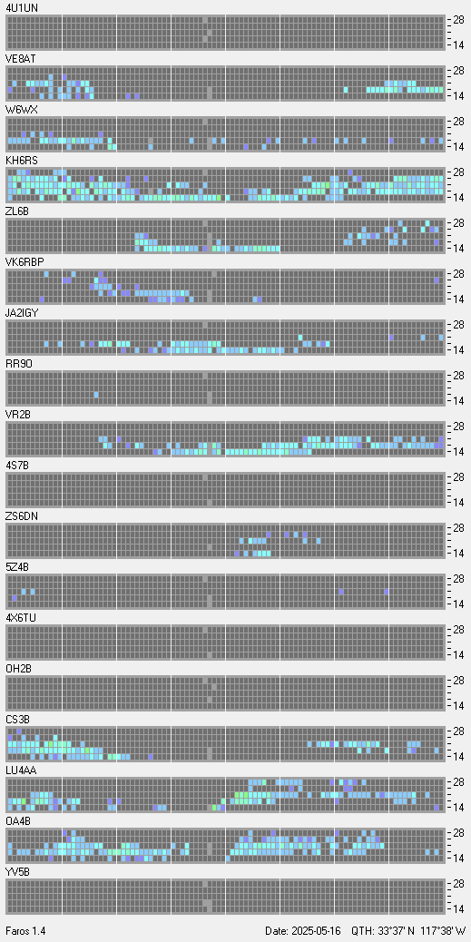 This is a record of NCDXF Beacon received at W6SI station using FAROS 1.4 monitor software. There are 18 beacons throughout the world, it records each ham band between 20m to 10m bands, including WARC bands. Each row on the given beacon block represents the band, 20, 17, 15, 12 and 10 meters, from the bottom to the top. The chart shows the relative signal strength (S/N ratio) of the received beacon. |