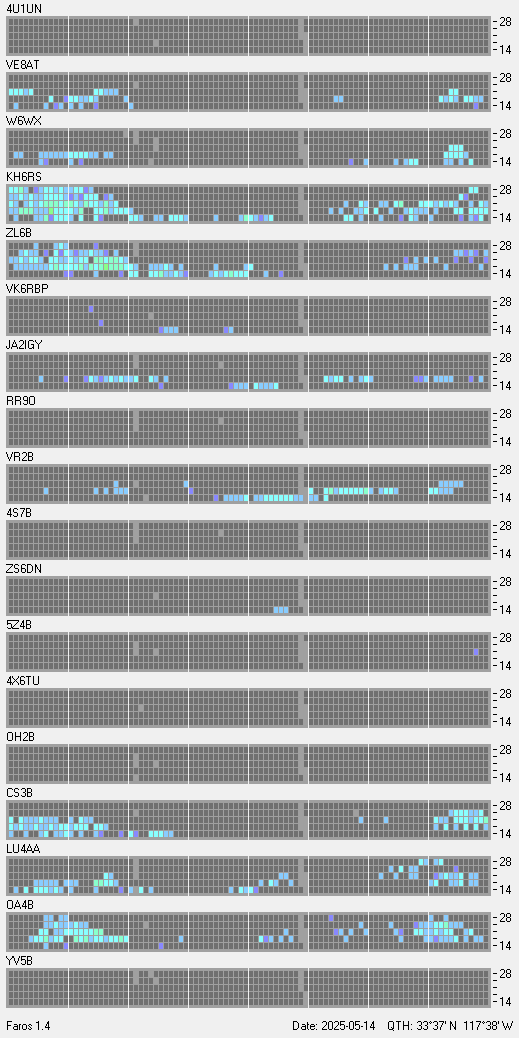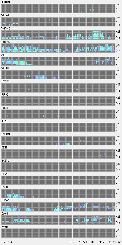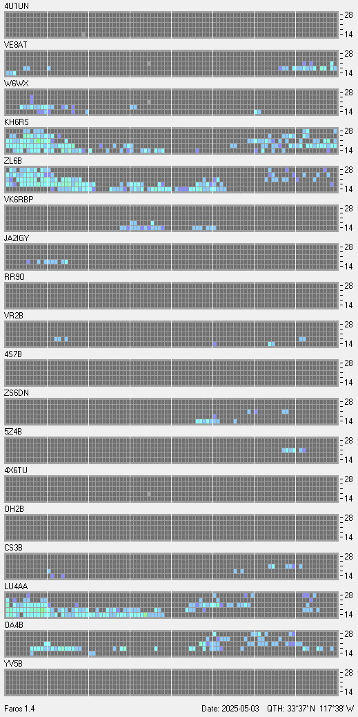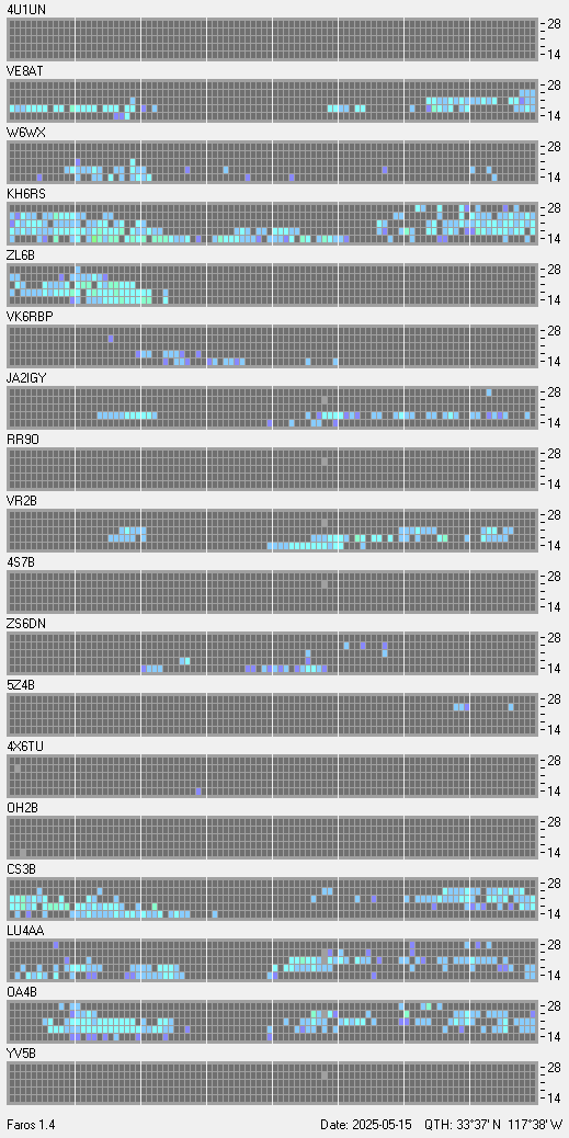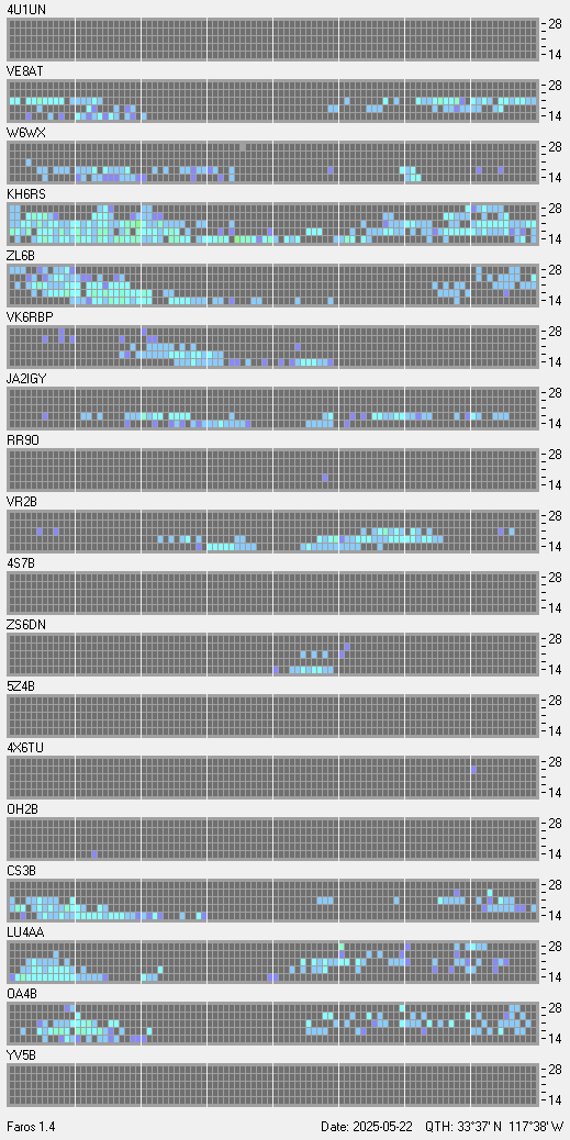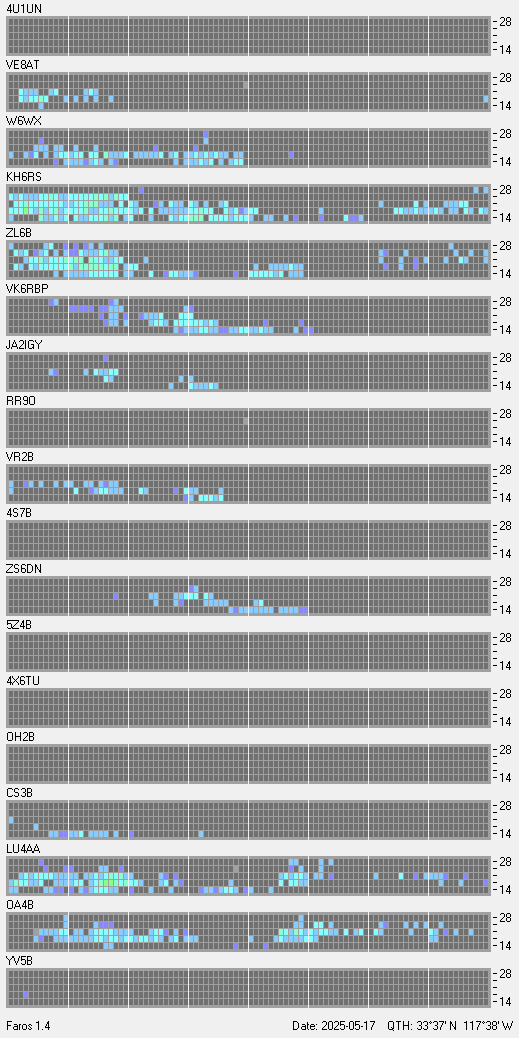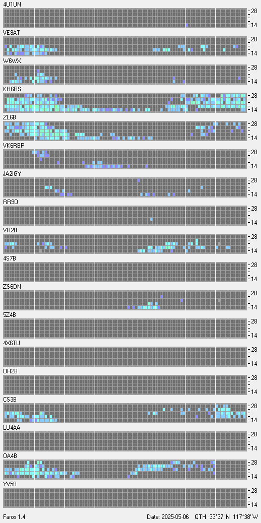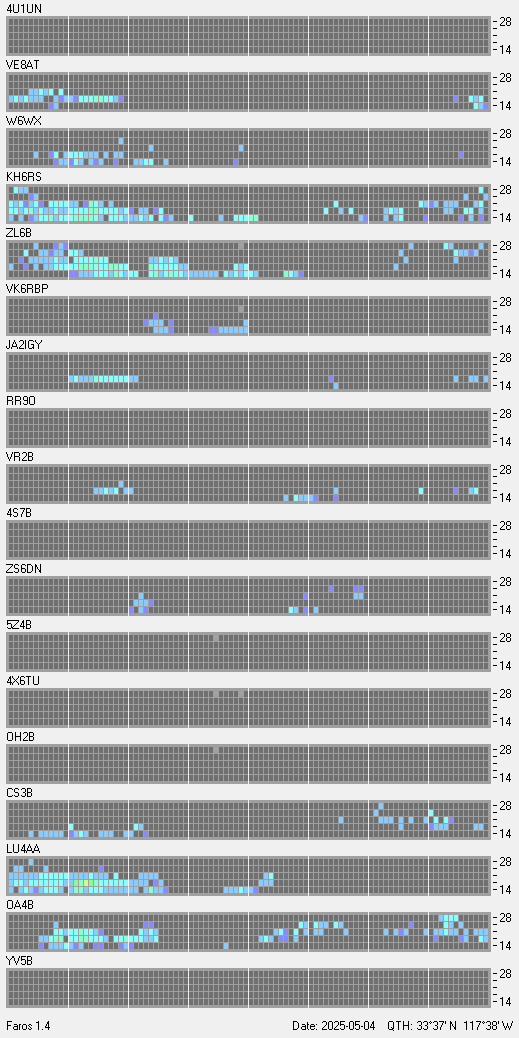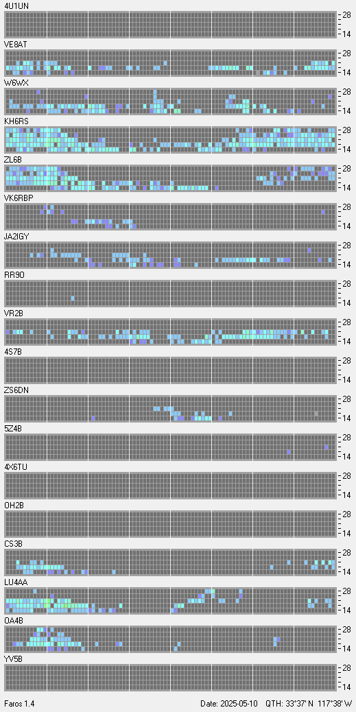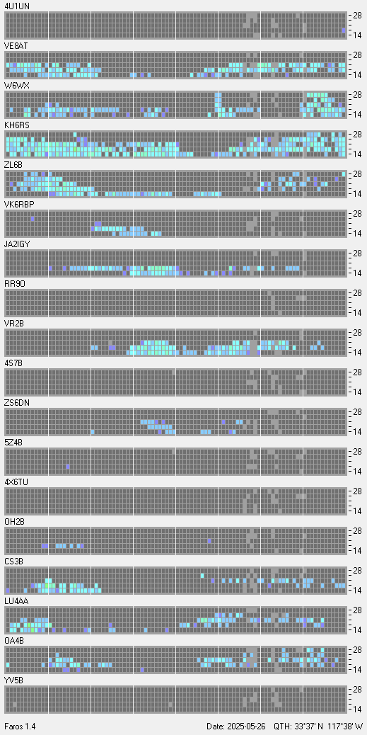 This is a record of NCDXF Beacon received at W6SI station using FAROS 1.4 monitor software. There are 18 beacons throughout the world, it records each ham band between 20m to 10m bands, including WARC bands. Each row on the given beacon block represents the band, 20, 17, 15, 12 and 10 meters, from the bottom to the top. The chart shows the relative signal strength (S/N ratio) of the received beacon. |
