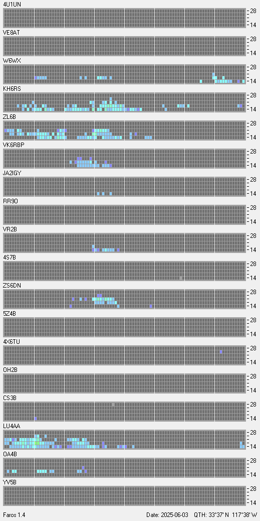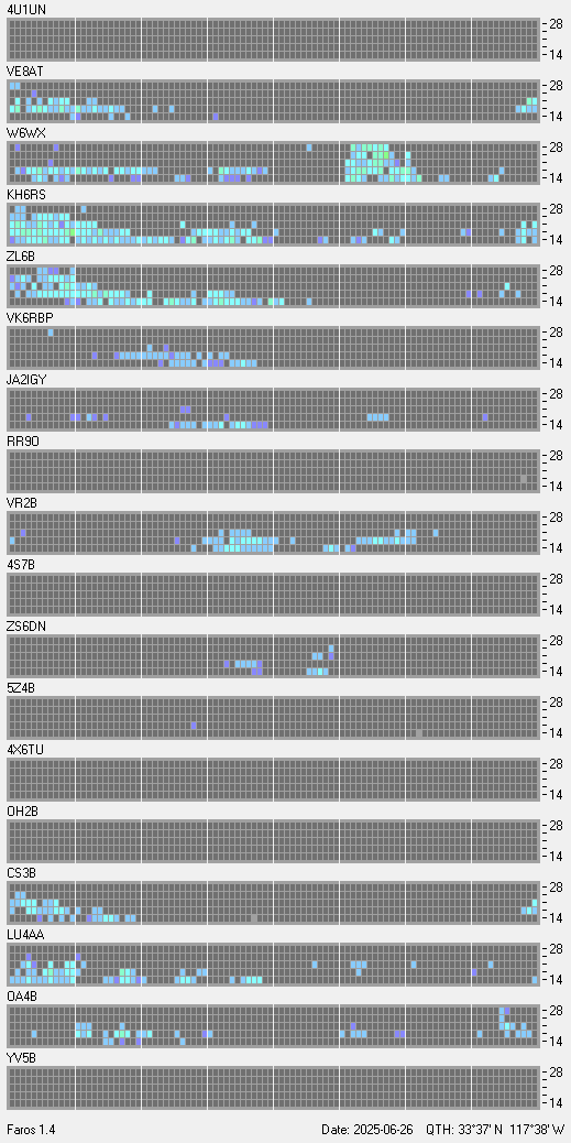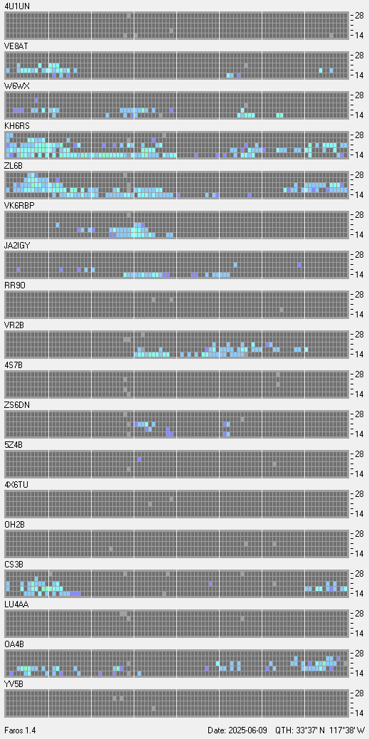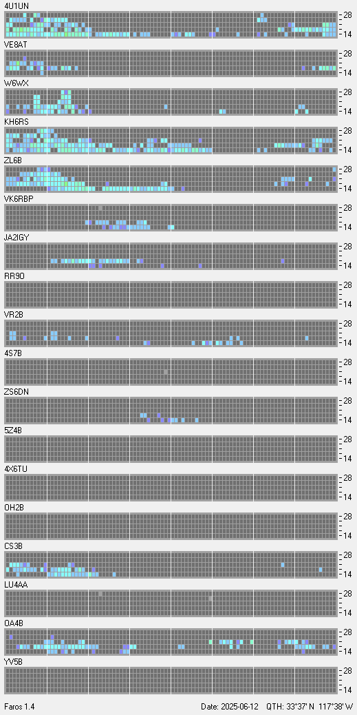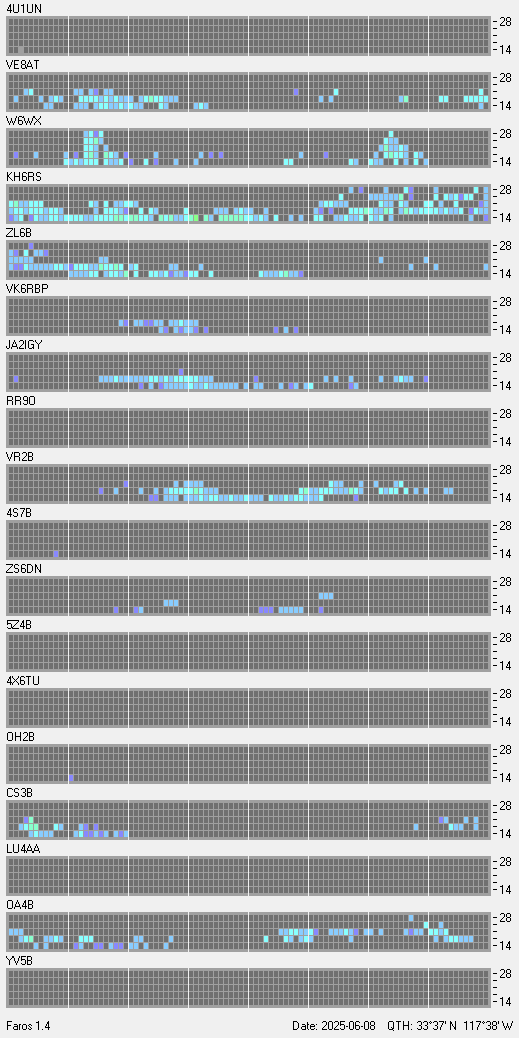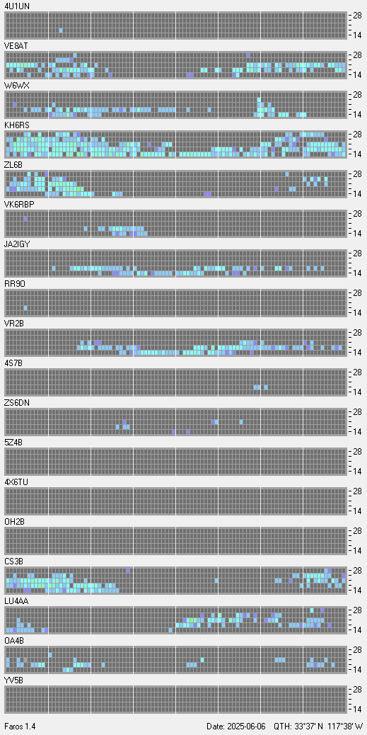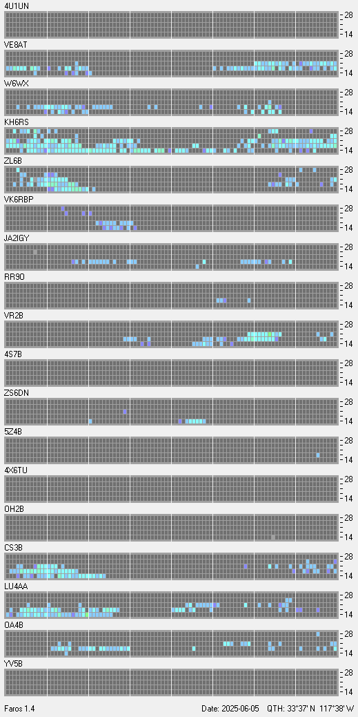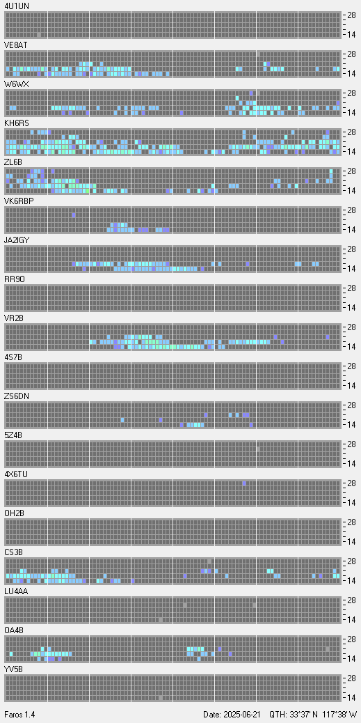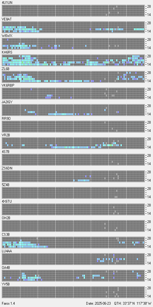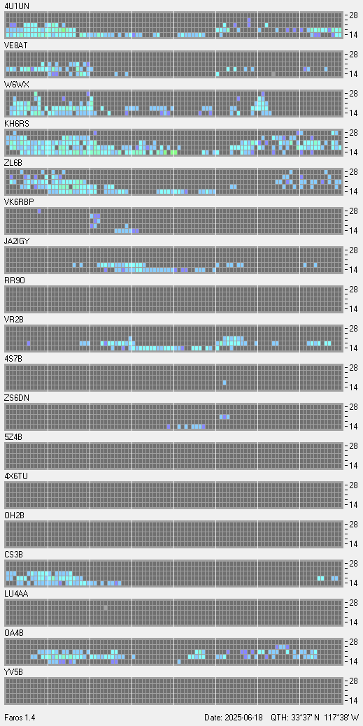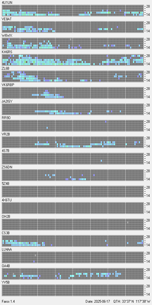 This is a record of NCDXF Beacon received at W6SI station using FAROS 1.4 monitor software. There are 18 beacons throughout the world, it records each ham band between 20m to 10m bands, including WARC bands. Each row on the given beacon block represents the band, 20, 17, 15, 12 and 10 meters, from the bottom to the top. The chart shows the relative signal strength (S/N ratio) of the received beacon. |