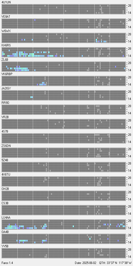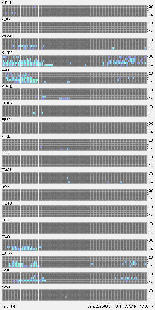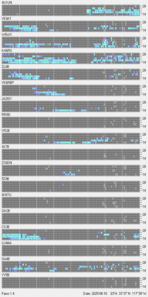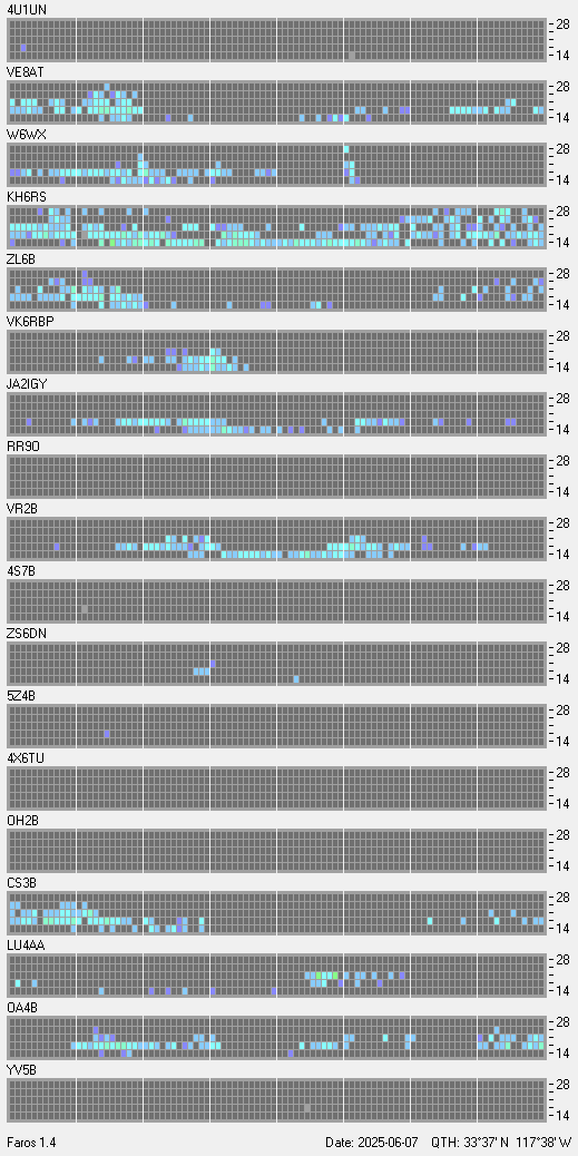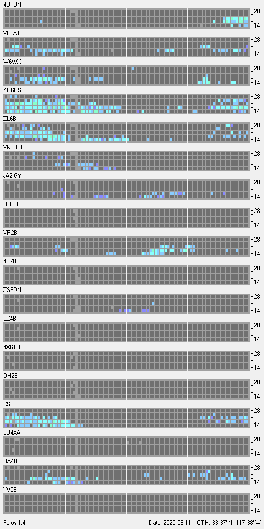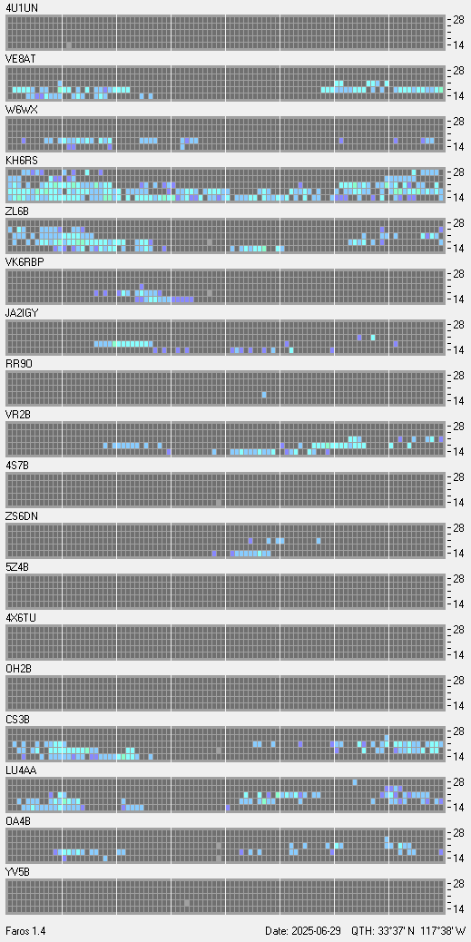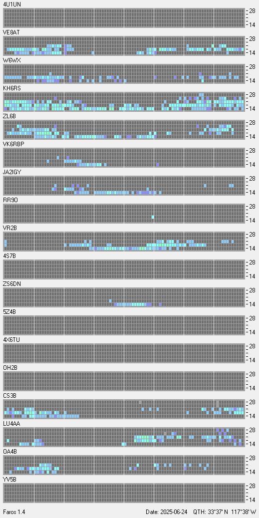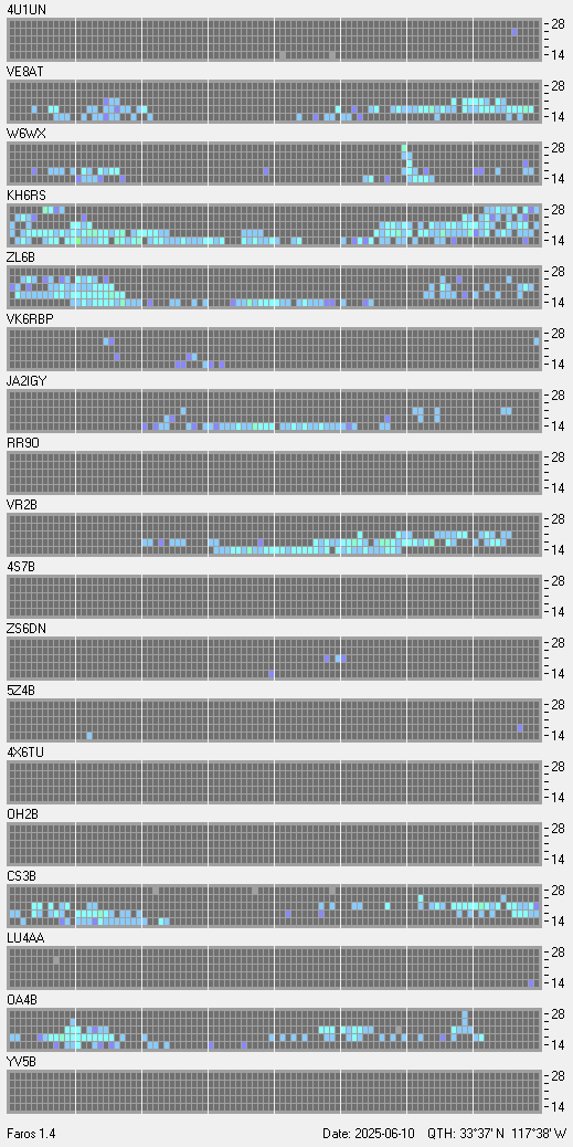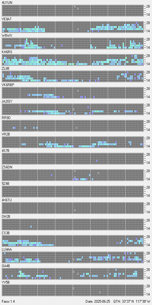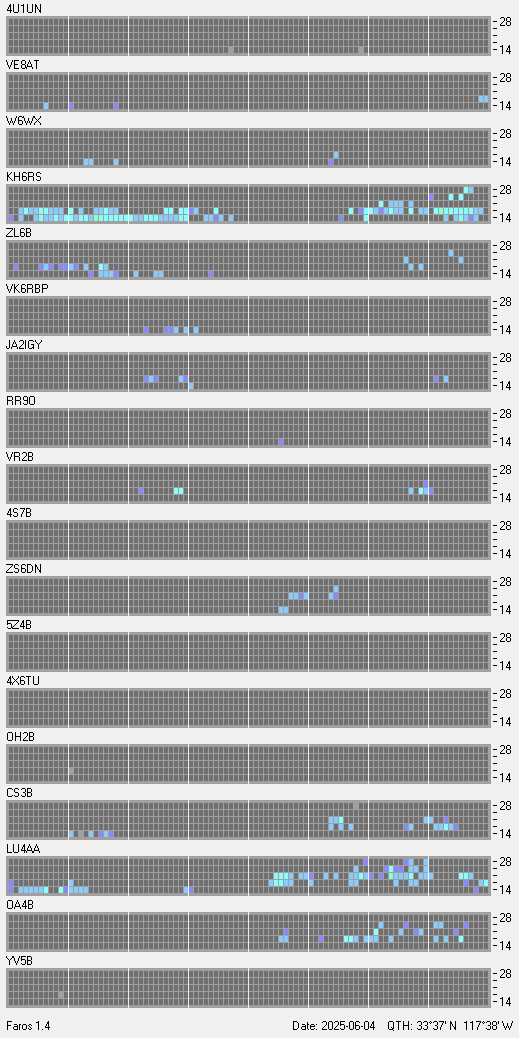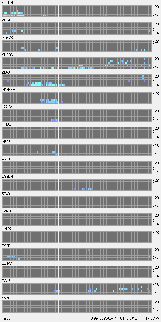 This is a record of NCDXF Beacon received at W6SI station using FAROS 1.4 monitor software. There are 18 beacons throughout the world, it records each ham band between 20m to 10m bands, including WARC bands. Each row on the given beacon block represents the band, 20, 17, 15, 12 and 10 meters, from the bottom to the top. The chart shows the relative signal strength (S/N ratio) of the received beacon. |