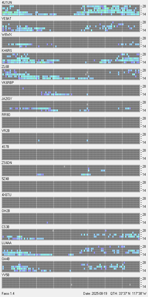 This is a record of NCDXF Beacon received at W6SI station using FAROS 1.4 monitor software. There are 18 beacons throughout the world, it records each ham band between 20m to 10m bands, including WARC bands. Each row on the given beacon block represents the band, 20, 17, 15, 12 and 10 meters, from the bottom to the top. The chart shows the relative signal strength (S/N ratio) of the received beacon. |