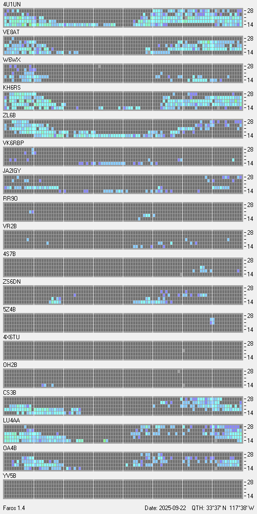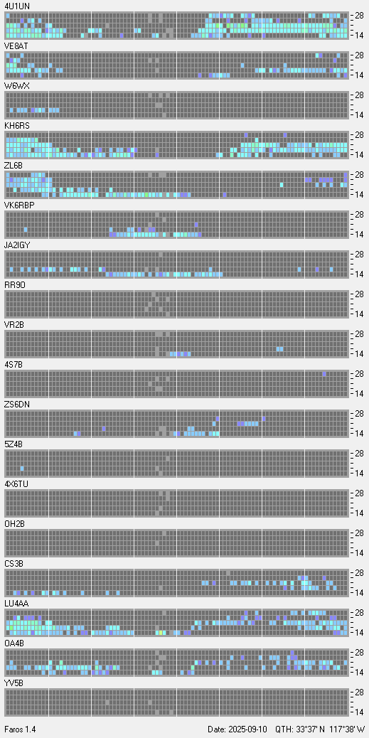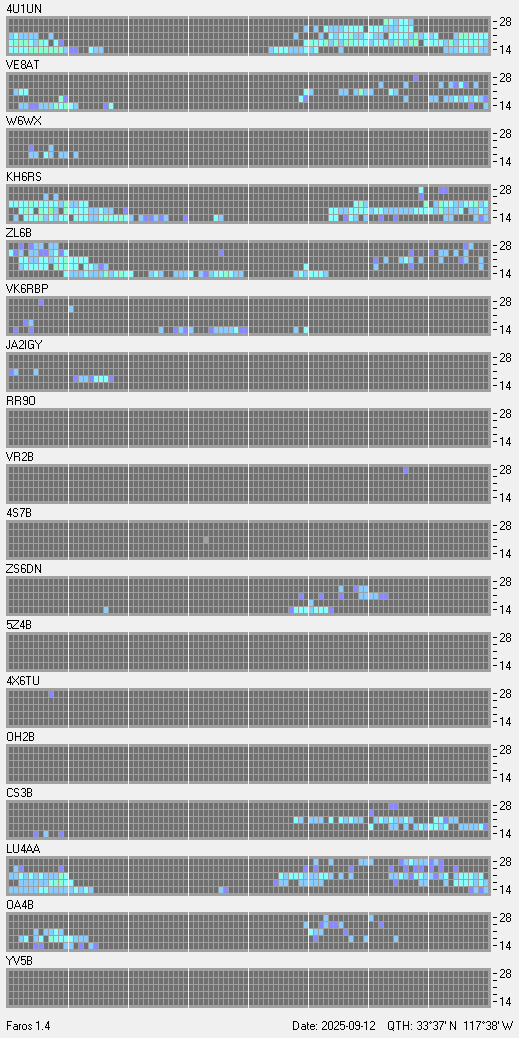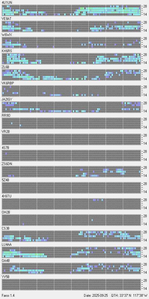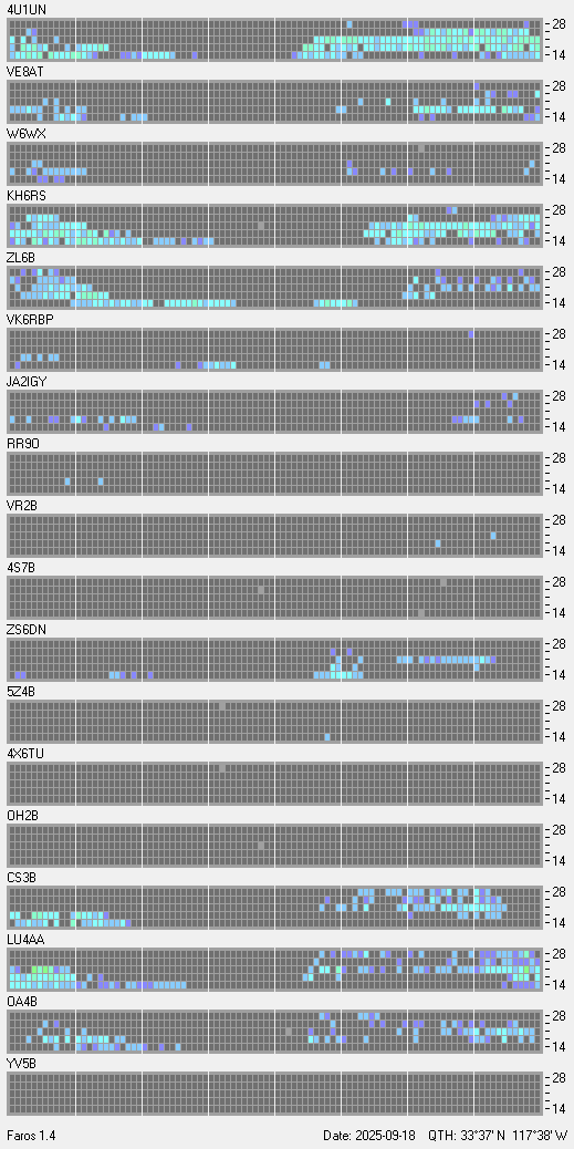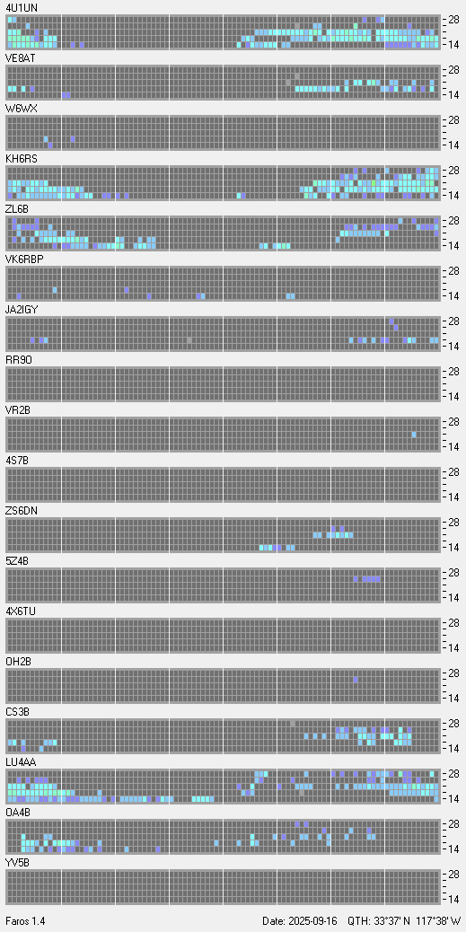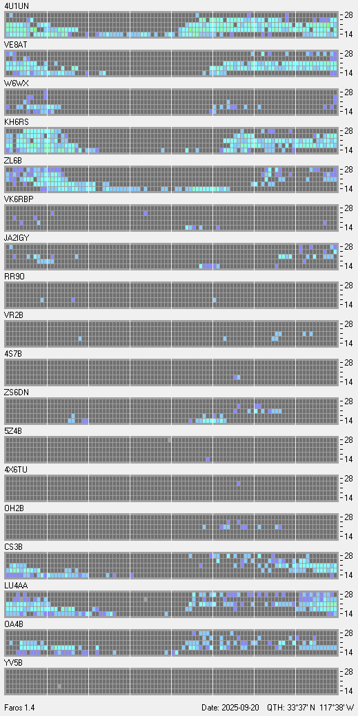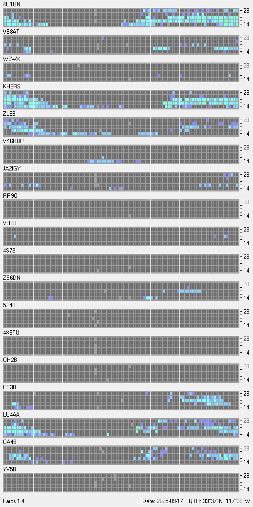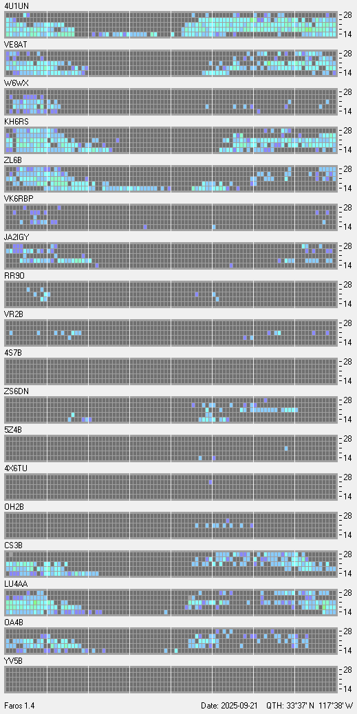 This is a record of NCDXF Beacon received at W6SI station using FAROS 1.4 monitor software. There are 18 beacons throughout the world, it records each ham band between 20m to 10m bands, including WARC bands. Each row on the given beacon block represents the band, 20, 17, 15, 12 and 10 meters, from the bottom to the top. The chart shows the relative signal strength (S/N ratio) of the received beacon. |