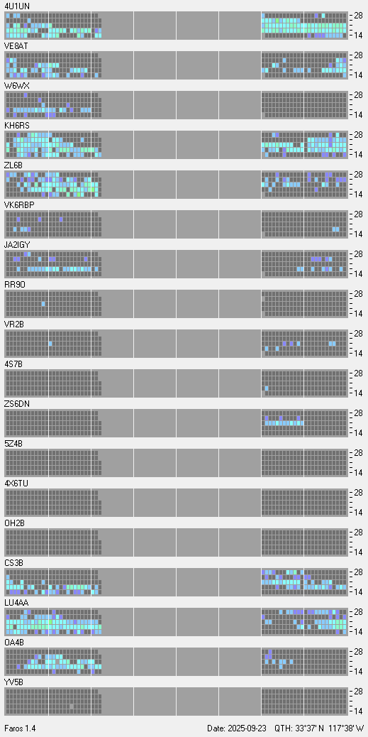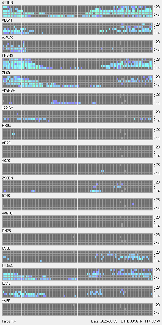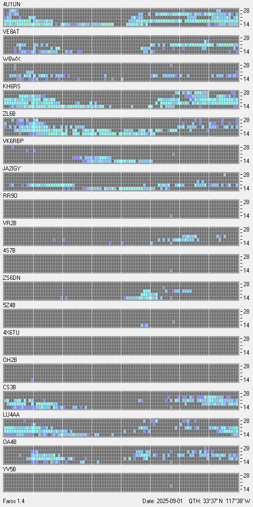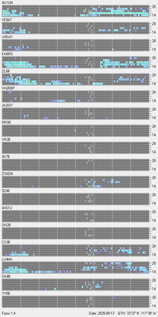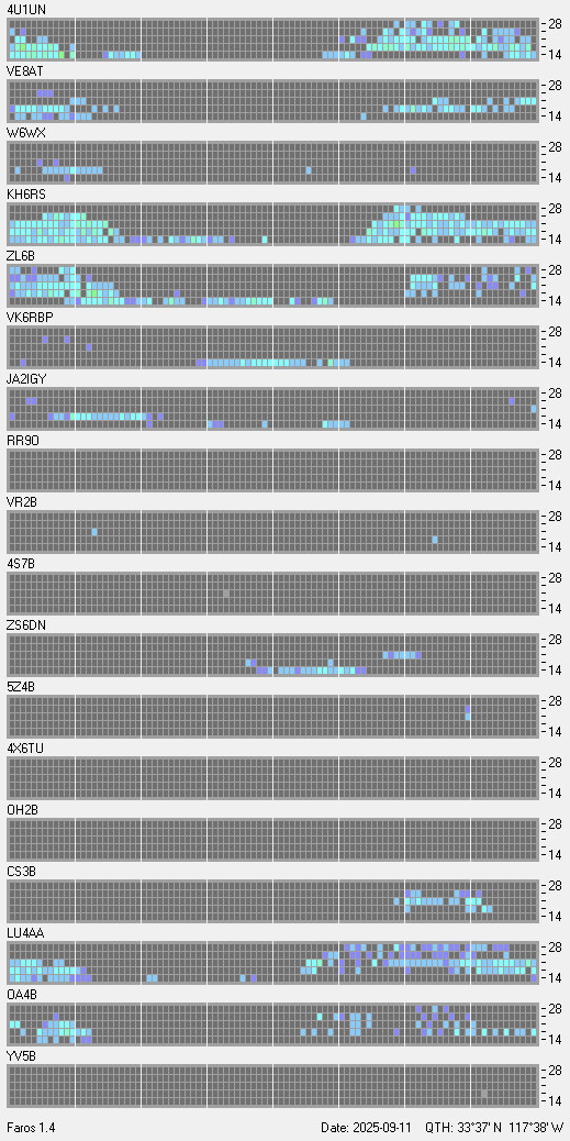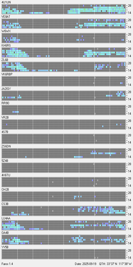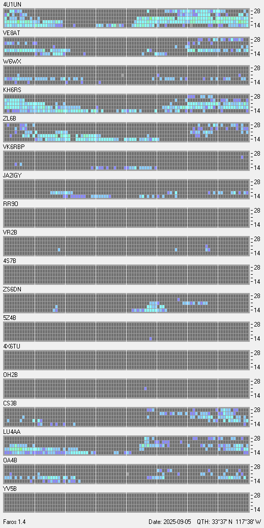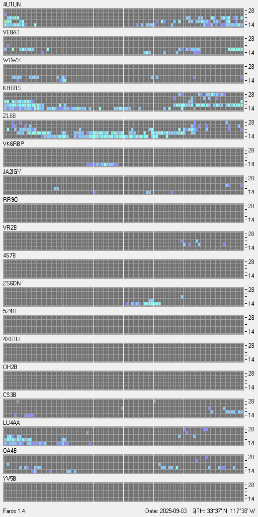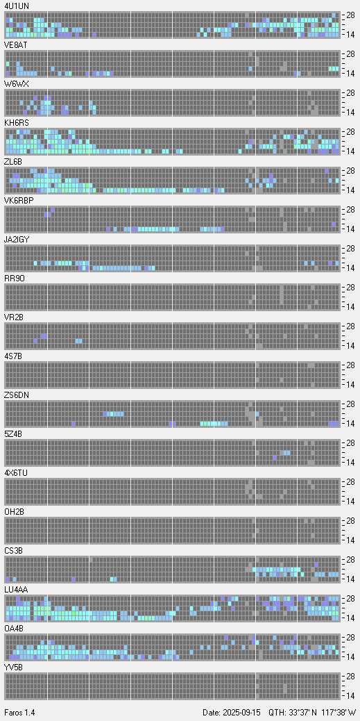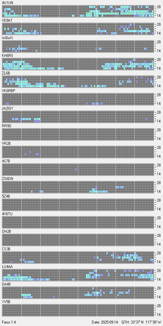 This is a record of NCDXF Beacon received at W6SI station using FAROS 1.4 monitor software. There are 18 beacons throughout the world, it records each ham band between 20m to 10m bands, including WARC bands. Each row on the given beacon block represents the band, 20, 17, 15, 12 and 10 meters, from the bottom to the top. The chart shows the relative signal strength (S/N ratio) of the received beacon. |