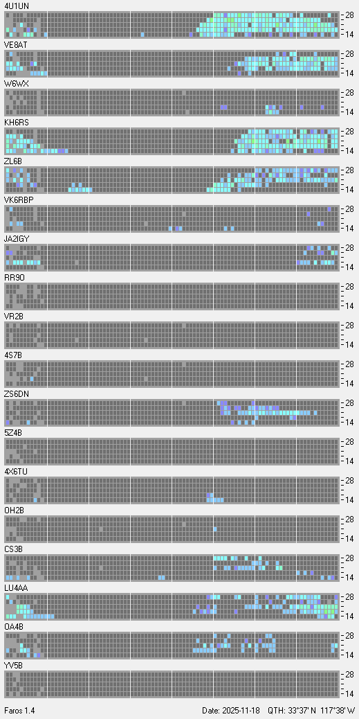 This is a record of NCDXF Beacon received at W6SI station using FAROS 1.4 monitor software. There are 18 beacons throughout the world, it records each ham band between 20m to 10m bands, including WARC bands. Each row on the given beacon block represents the band, 20, 17, 15, 12 and 10 meters, from the bottom to the top. The chart shows the relative signal strength (S/N ratio) of the received beacon. |
