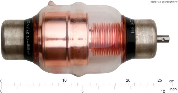 This is the capacitor of choice by DIY builders of magnetic loops. It has high voltage tolerance, good capacitance and precision tuning mechanism. The pictured one is about 500pF, 10KV. Good and sturdy, but a bit fragile. Not small (the pictured one is about 25cm long). An adjustment mechanism must be provided ad-lib. And EXPENSIVE (> $200), if you can find one. It doesn’t appreciate being out in the element, so if your antenna is an outside permanent installation, you will need to house it in a good casing.