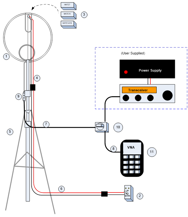 feedline cable (RG213), 8 - short jumper cable, 9 - F/F adapter, 10 - 2 port coax switch, 11 - VNA (MFJ-226)