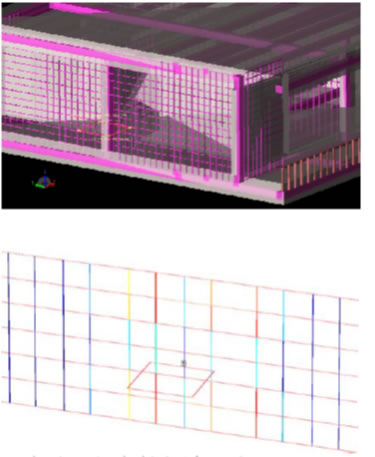He used E-field simulator XFdtd to simulate the phenomena by building a model that includes the building structure as well as the MLA antenna. It predicted when the antenna is about 70cm away from the front of the building, the radiation efficiency improved to 56% (from 34% with MLA alone) on 20 meter band. According to the analysis of Dr. Kogure, JG1UNE, when the grid of the steel rod is wide enough, the current profile similar to ½ lambda dipole is induced on those steel rods to boost the transmission radiation. The lower picture is an output from another E-field simulator Sonnet showing the surface current distribution (note the MLA in middle front, depicted as a rectangular loop). |