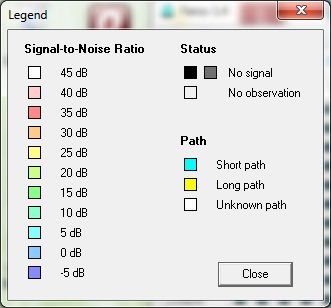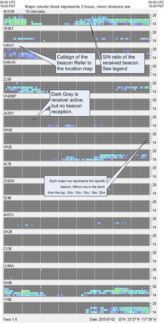 The image on the right shows how each chart looks like and what they represent. Received beacon on a given band, given time are shown in blue, green, to yellow (I never saw red or white) dots. Where are those beacons located? The monitor station (which is also my base station) consists of: Location: So. California 33° 37' N, 117° 38' W, DM-13 Color legend for the chart: |