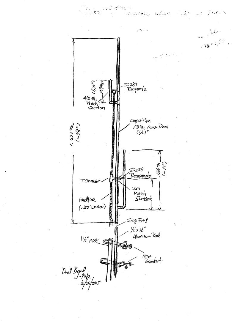 Then came a problem. The base of the antenna, the part below the 2m match section, was not long enough to support the antenna. Since it is entirely made of copper pipe, the top heavy antenna needs a solid attachment to the mast to be safely supported. Then I realized a simple fact. When you say ½” pipe, it means the inner diameter. And it actually slightly larger than ½”. I measured (with my metric caliper) 13.5mm. Almost 1mm thicker than ½”. Then I went to the Home Depot and found ½” aluminum rod. The Rod is (obviously) measured with outer diameter. In short, the ½” rod is a snug fit to ½” copper pipe. I bought a 36” rod and tried it on the J-pole. A perfect fit. I wrapped a layer of rubber tape at the middle of the rod, so it won’t go any deeper inside the antenna beyond that. Now it’s time to climb the ladder to the top of chimney. I cut the story short. It was a little struggle to dismount the discone antenna. I thought it was just sitting on the top of the mast, but it refused to come off. Since I was in a pretty precarious position at the top of the ladder, I had to change the plan and dismount the steel mast altogether to remove the old and mount the new antenna. I had a stock of a pair of U-bolt assemblies with mast brackets (purchased from SolidSignal.com) to attach the J-pole to the top of the mast, and raised the mast back on the chimney, utilizing the existing wall mount. At that point, the SWR reading of the antenna was pretty much the same as the one I measured on the ground (1.7 ~ 2). Not great, but usable. So while on the ladder, I used my HT to see if I can make a contact via the repeater with a low power (1Watt). I did. And it sounded like full quieting. For my application, the J-pole antenna is clearly outperforming the incumbent discone. |