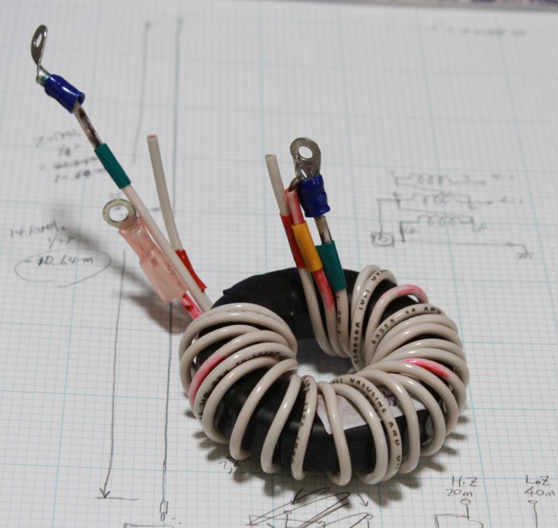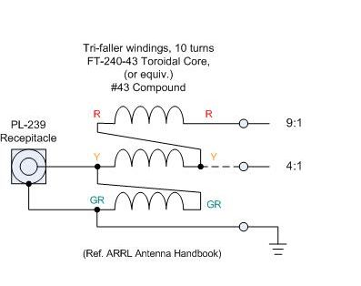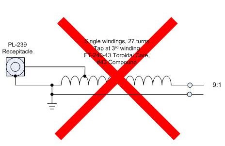 <* Big Failure Warning: Do Not Try this at Home*> This is because the input link does not have enough windings to produce sufficient inductance. You are just feeding the input power to ground, heating up the wire in the process. Got to do it the right way. If you want a 4:1 balun (or unun), you need to do bifilar windings, i.e, two independent wires wound together side by side. For 9:1, you do tri-falar, or three wires wound side by side. This is not difficult, but takes some getting used to, especially if you would like to use a wires of decent gauges to allow fair amount of power to go through. I used PVC insulated 14 gauge . |