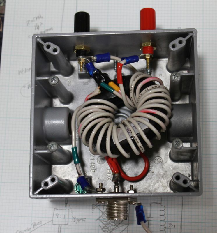 Any antenna analyzer with impedance reader can be used. I happened to use MFJ -226 VNA (the cheapest VNA you can buy today). It reads 36.9 ohms at 9MHz. The impedance increases as frequency goes higher (to about 100MHz), and that’s mainly because the resistor is not a non-inductive RF variety. The toroid itself looks good enough for the HF application. So I housed the finished unun to an exterior utility box I bought at a local hardware store (Figure 5), a.k.a. Denault's True Value. It is reasonably weather tight and cheap. The moisture will get inside no matter what, so I drilled a hole at the bottom so water can get out. I’ve had this thing out there during wet winter this year, and it stayed dry and working. Now I have a working 9:1 unun. Don't know yet if / how I would use it for my Mission Viejo Special Mark2 project (it's been hooked up in the antenna still work in progress), but it was fun doing it. (to be continued…)